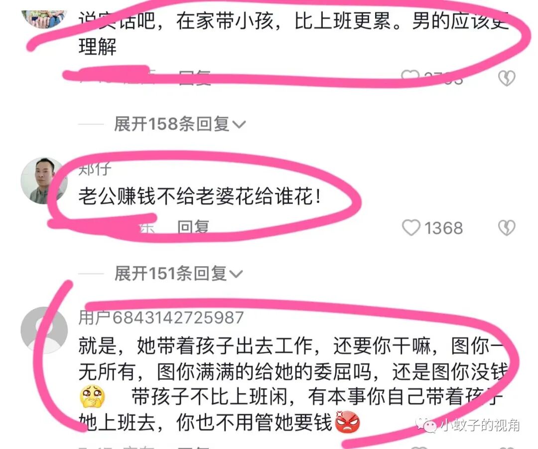 还有网友赞同女子的说法,道:就是,她带着孩子出去工作,还要你干嘛?替你一无所有,图你给她满满的委屈吗?还是图你没钱?带孩子不比上班清闲,有本事你自己带着孩子,让她去上班,你也别跟她要钱!