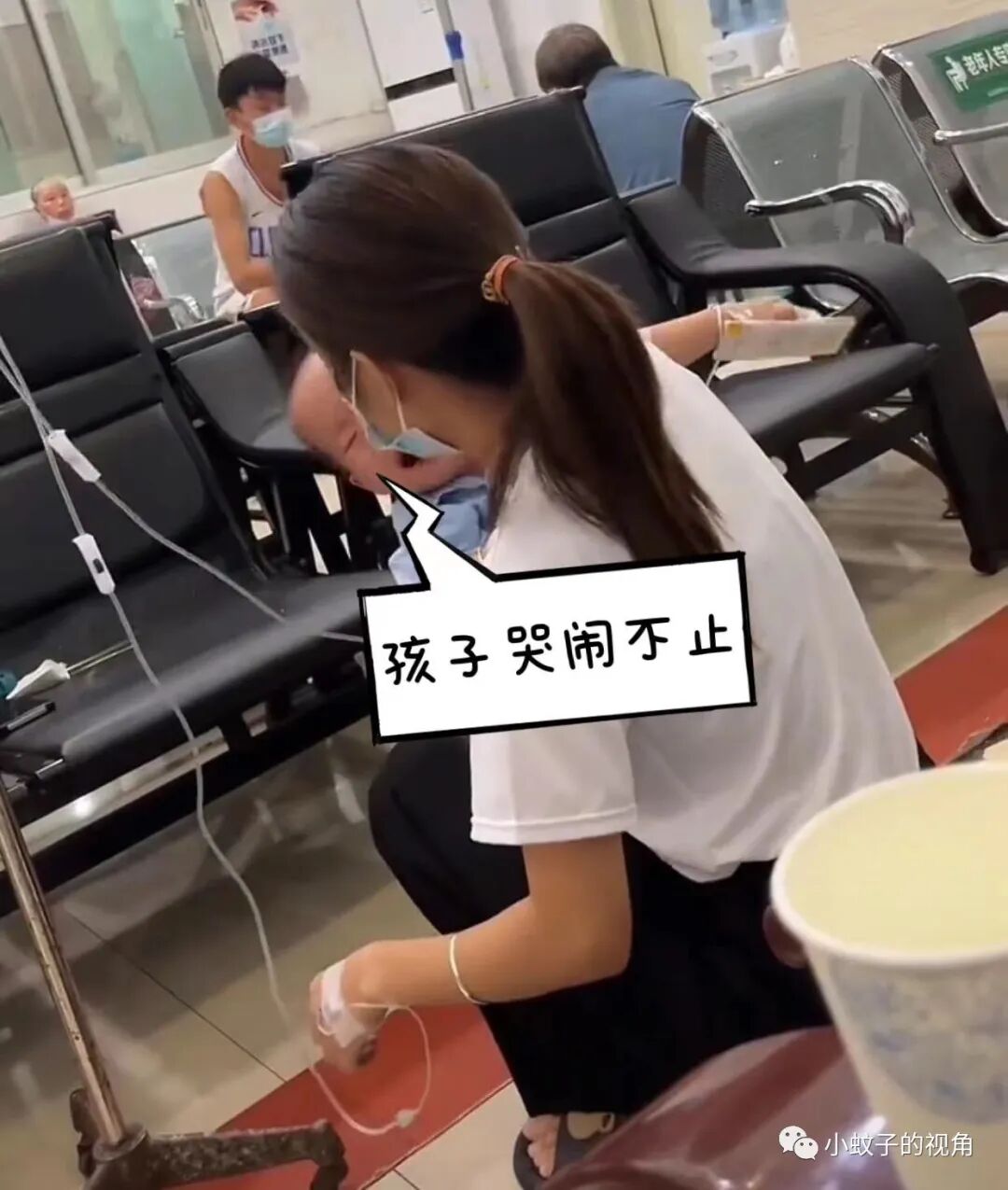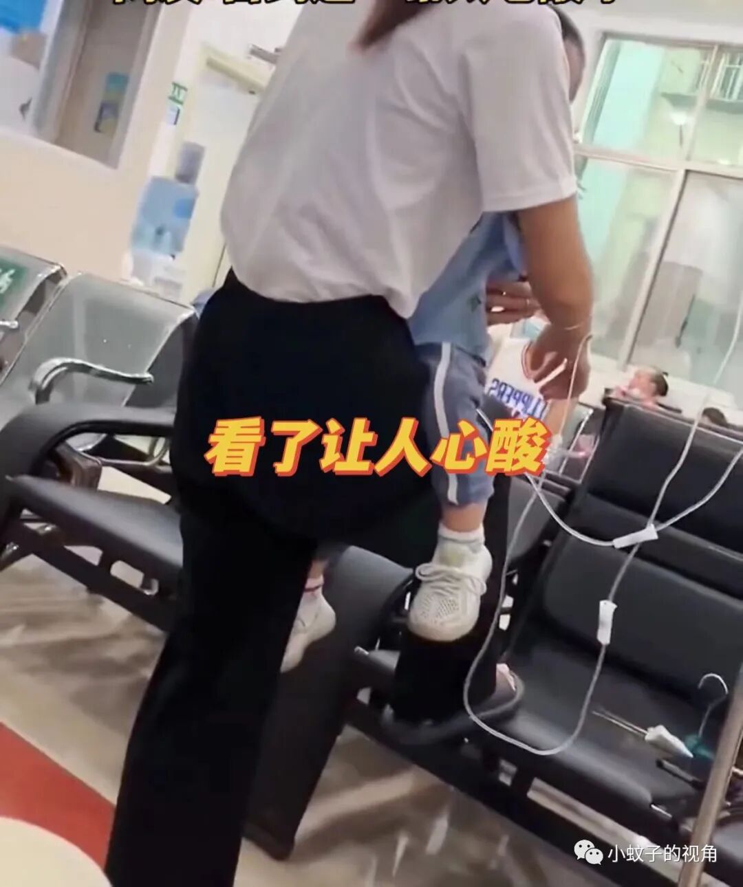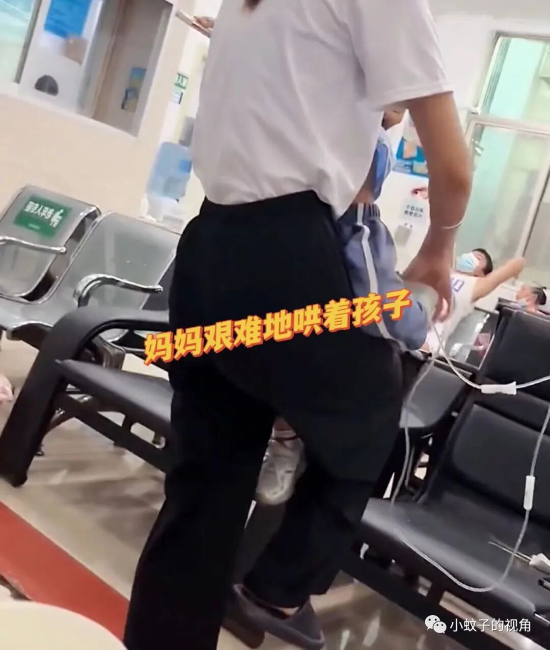 这位妈妈却非常坚强,自己一只手打着吊瓶,另一只手拦着孩子,为了安慰哭闹不止的孩子,女子还不停地站起来,把孩子往上托,以方便自己抱紧孩子。