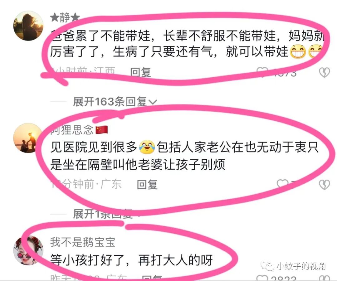 还有网友说:在医院见到很多,人家老公在跟前也无动于衷,只是坐在隔壁叫他老婆看好孩子,让孩子别烦。