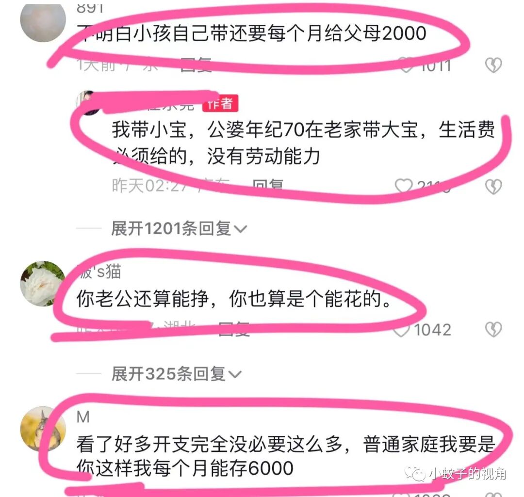 女子回复:我带小宝,公婆年纪70多了,在老家带大宝,生活费必须给的,没有劳动能力了。