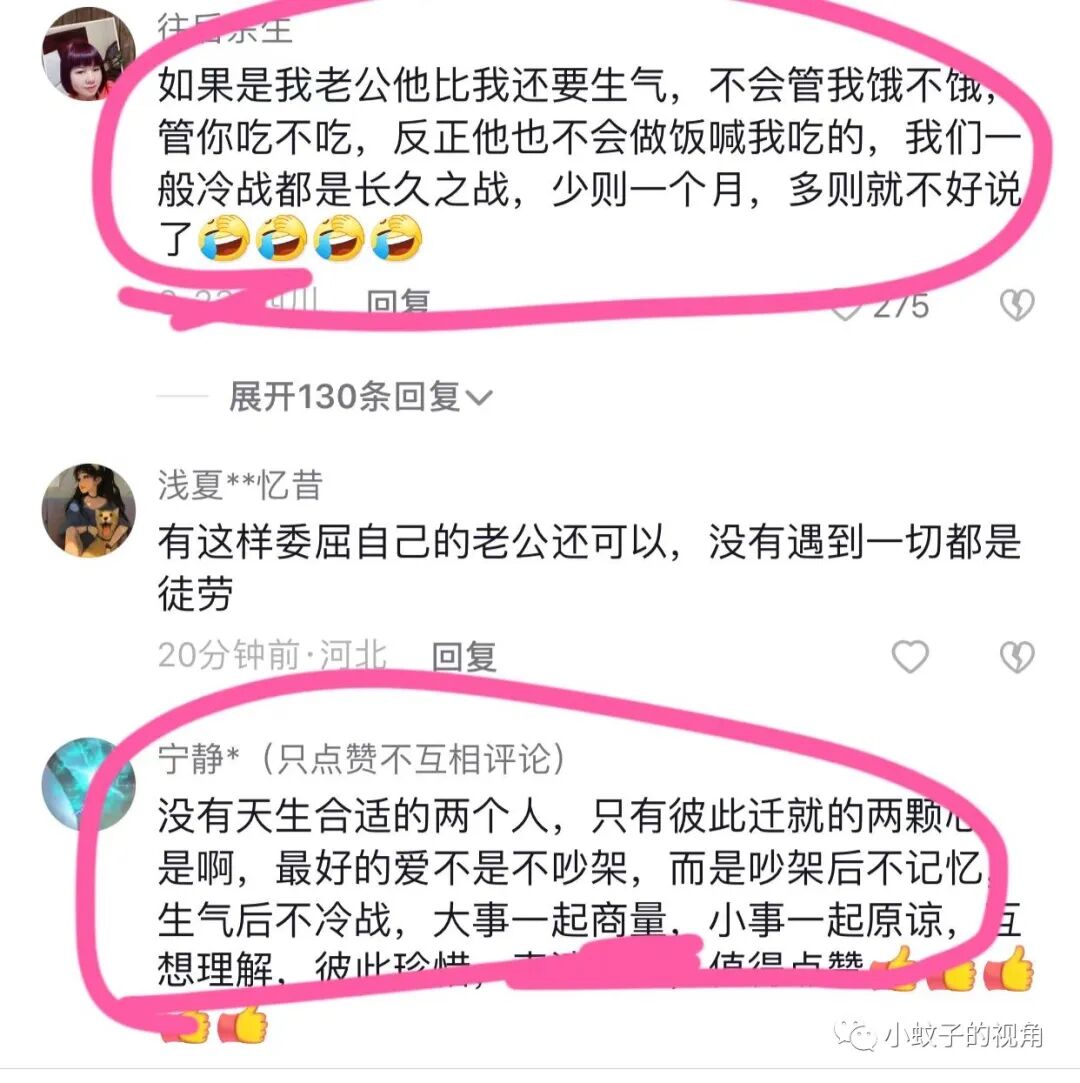 网友表示羡慕,说:如果是我老公,他比我还要生气,不会管我饿不饿,管你吃不吃,反正他也不会做饭喊我吃的,我们一般冷战都是长久之战,少则一个月,多则就不好说了。