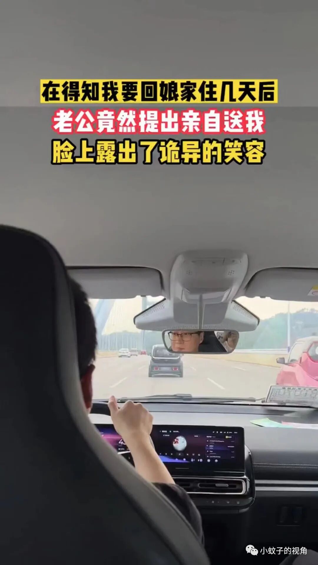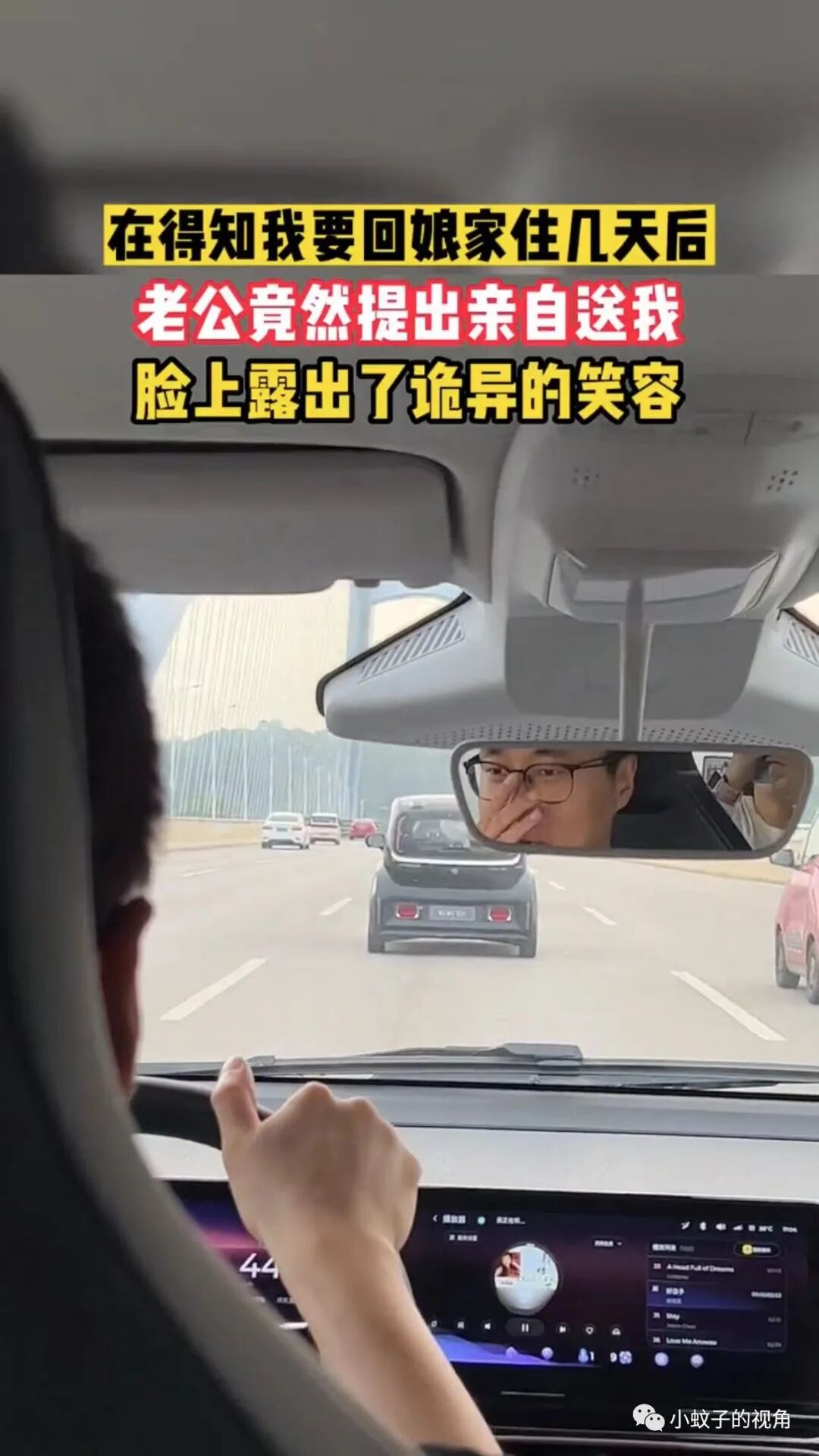 坐在后座的她,无意之中在后视镜里看到了老公脸色诡异的笑容。