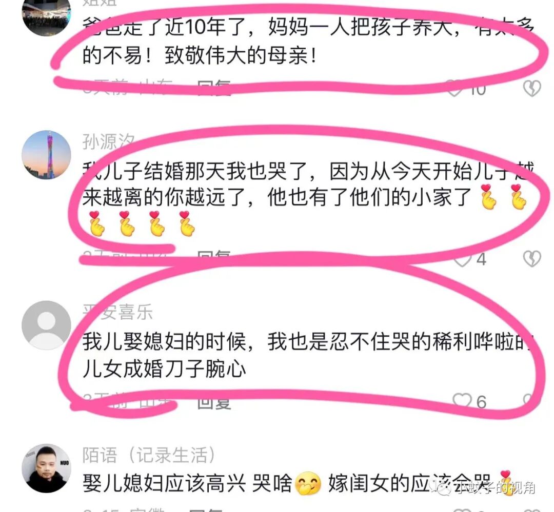也有网友说:我儿子娶媳妇的时候我也是忍不住哭得稀里哗啦,儿女成婚刀子剜心。