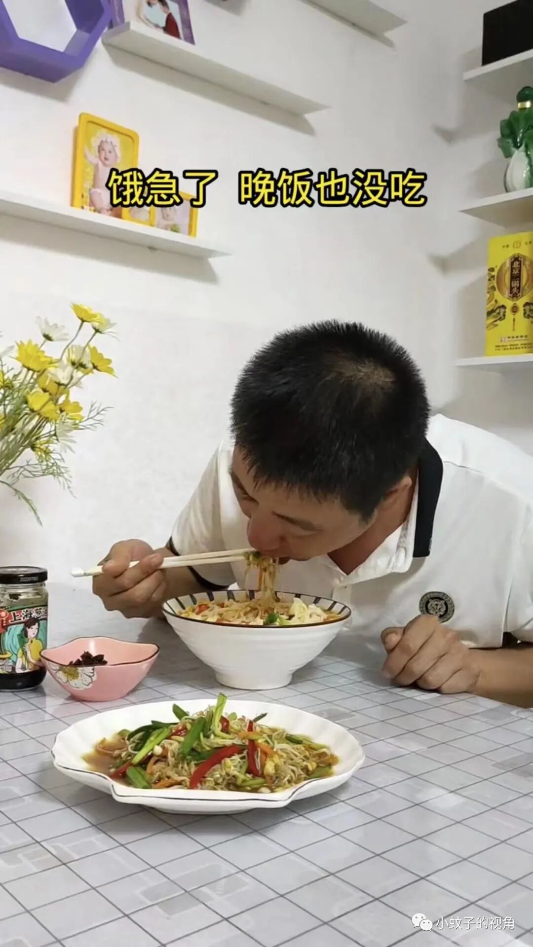 等他洗澡完毕,热汤面也做好了,配上一盘凉拌豆芽,老公吃开心,坐在旁边的妻子笑意盈盈地递上一瓣大蒜,两个人有说有笑。