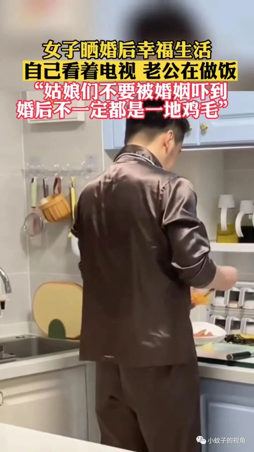 这次她分享的是老公正在做饭的画面,她坐在客厅看电视,电视里演着女生们都爱看的宫斗剧,老公正在厨房汗流浃背地做饭,她忍不住拿起手机拍摄。