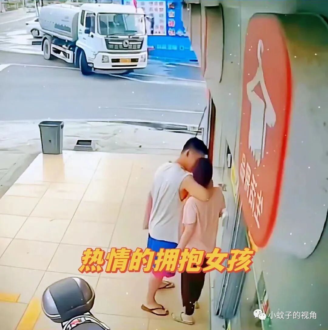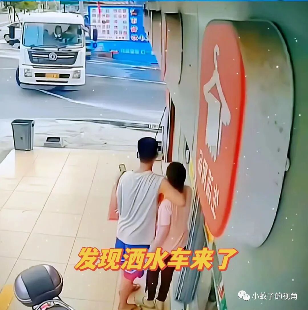 男孩一直拥抱着女孩,两个人的样子看起来非常甜蜜,网友并没有快速超过这对情侣,而是停靠在路边不再动弹,因为他看到前方驶过来一辆洒水车。