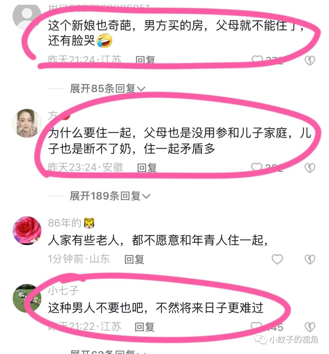 有的网友赞同这个观点,说:这个新娘也是奇葩,男方买的房,父母就不能住了吗?还有脸哭。