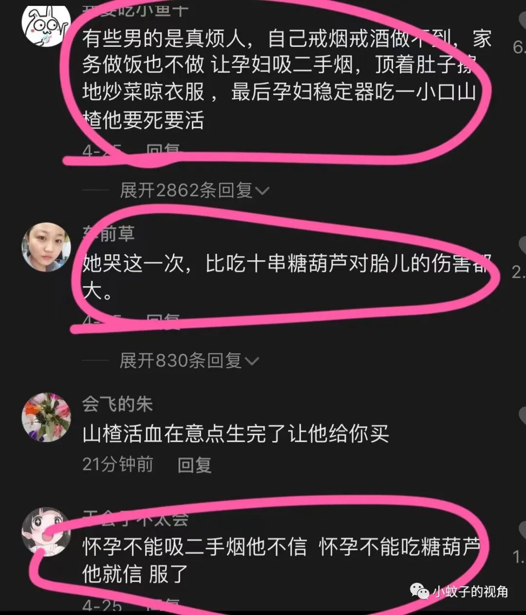 网友说:有些男的是真烦人,自己戒烟戒酒做不到,家务做饭也不做,让孕妇吸二手烟,顶着肚子擦地炒菜晾衣服,最后孕妇稳定了,想吃一口山楂他要死要活的。