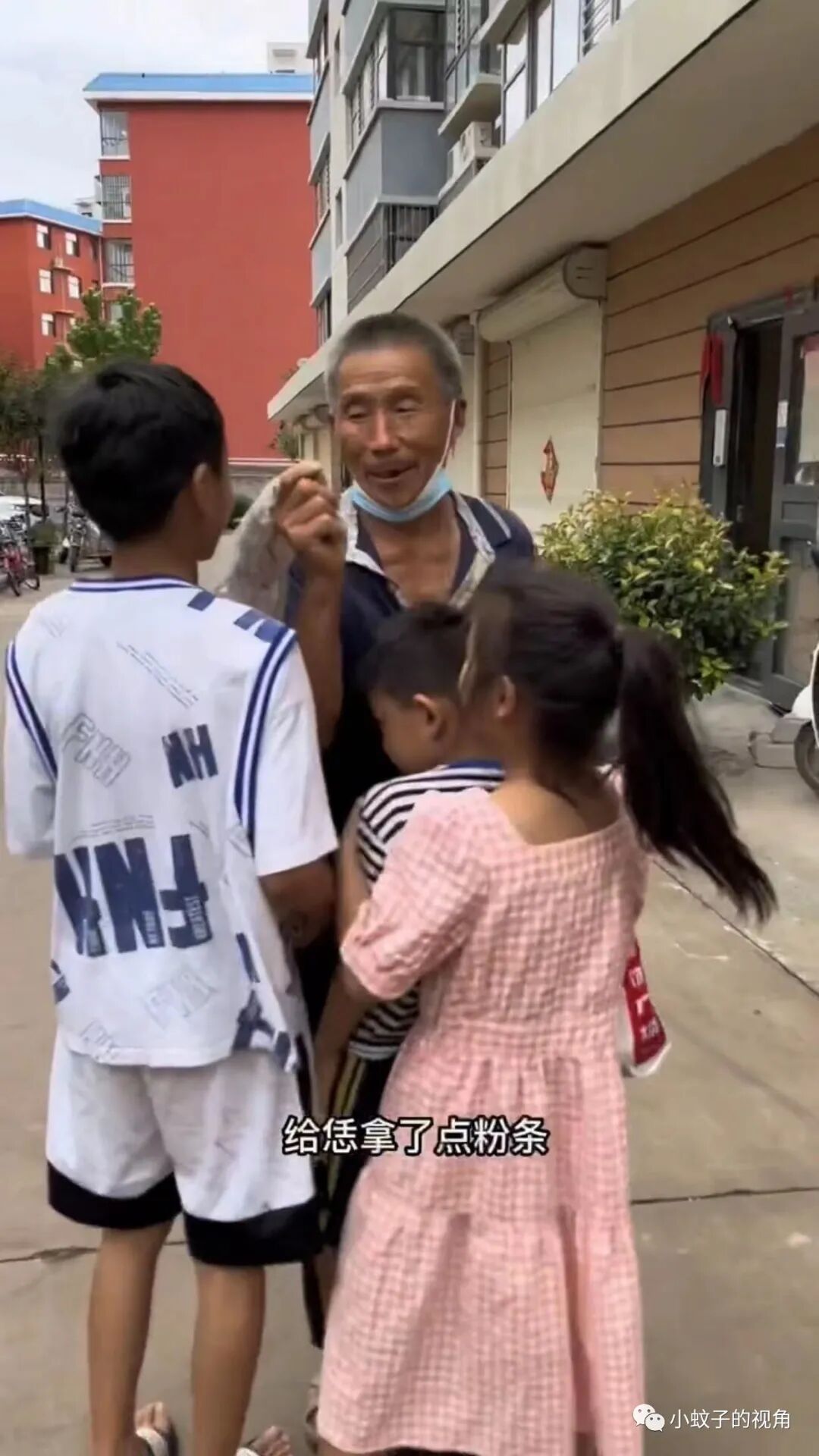 老人说:“给你们送点粉条,刚做出来的。”说着就把手里的粉条一个小袋子递给女子,孩子们依然围着老人十分亲热。