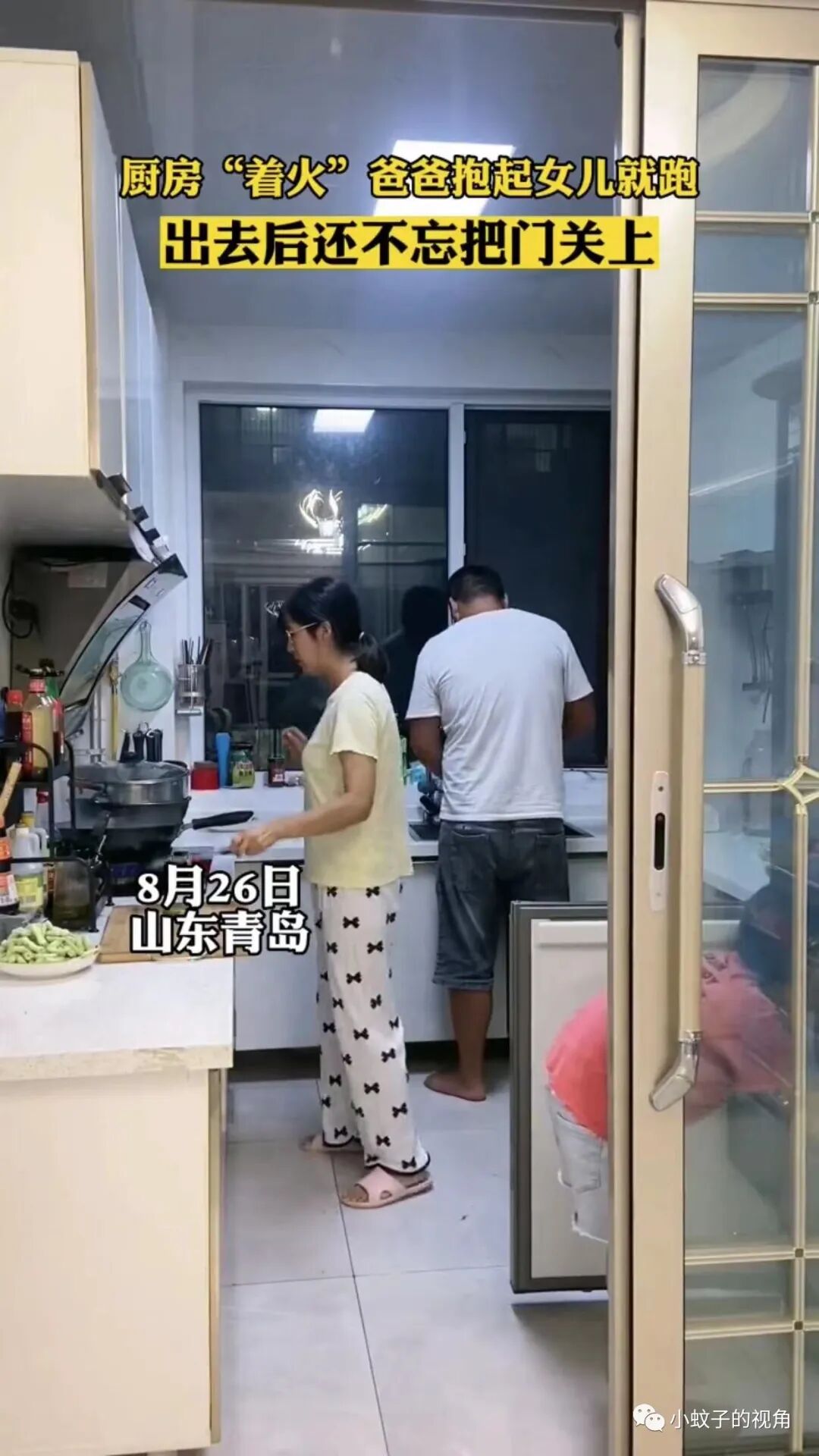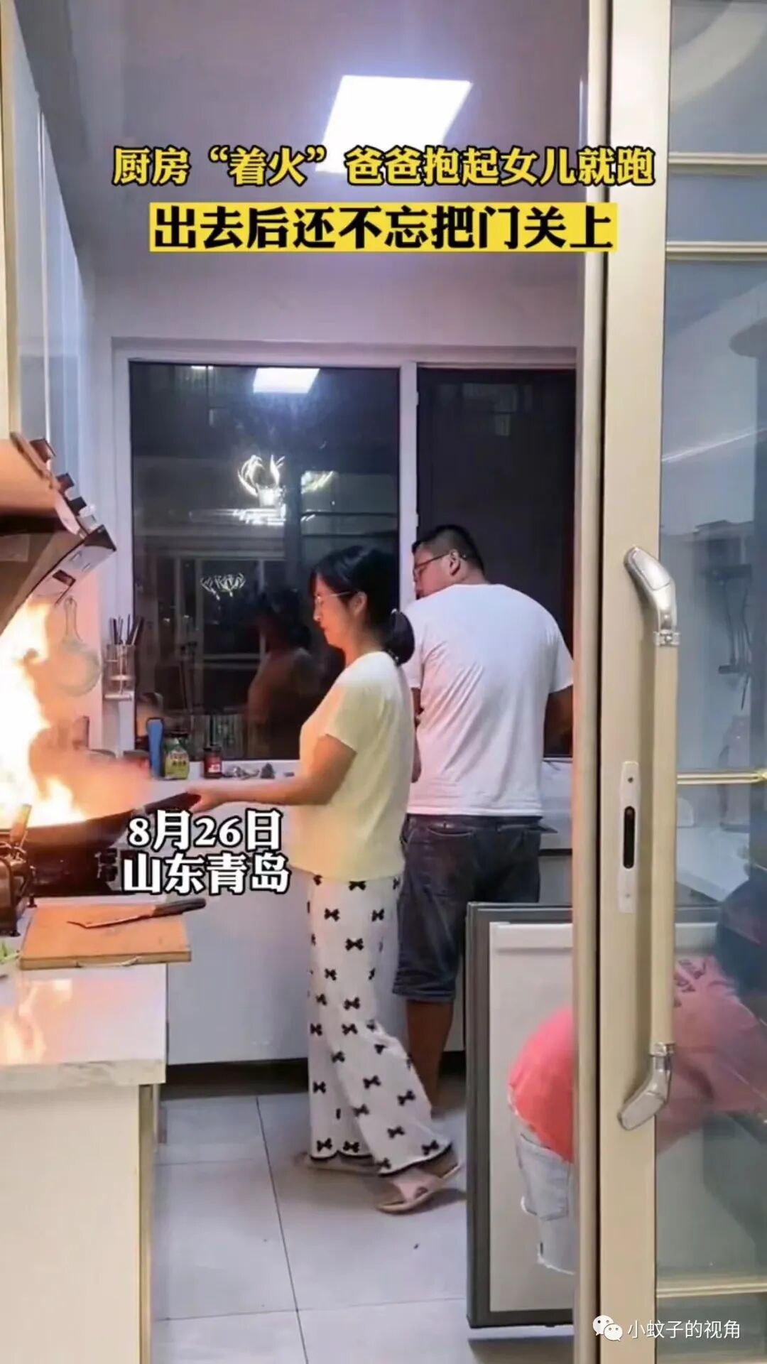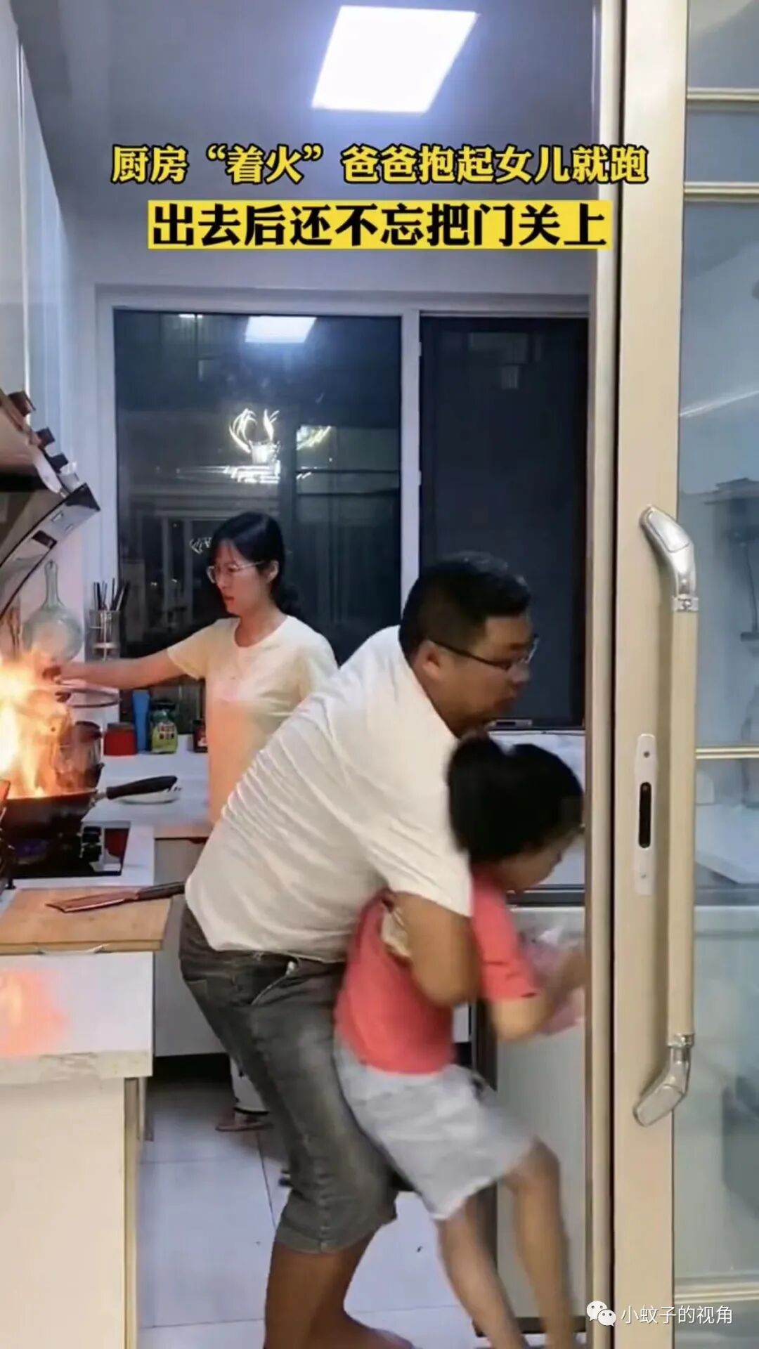 然而,老公看到灶台着火了,吓了一大跳,赶紧从老婆身后挤过去,往客厅跑。中途还不忘把孩子一起抱出去。