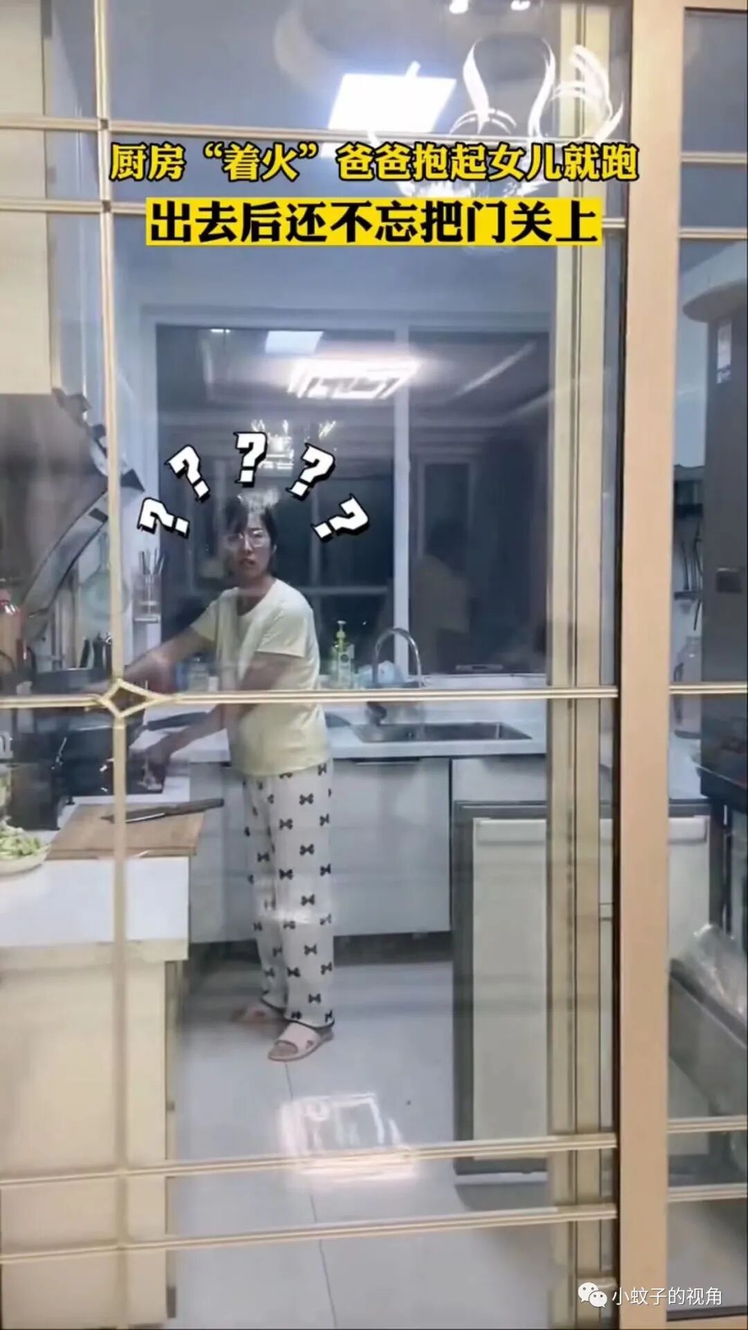 然而,这位老公抱着孩子跑出厨房后,顺手就关上了厨房的玻璃门!把老婆关在了厨房里!