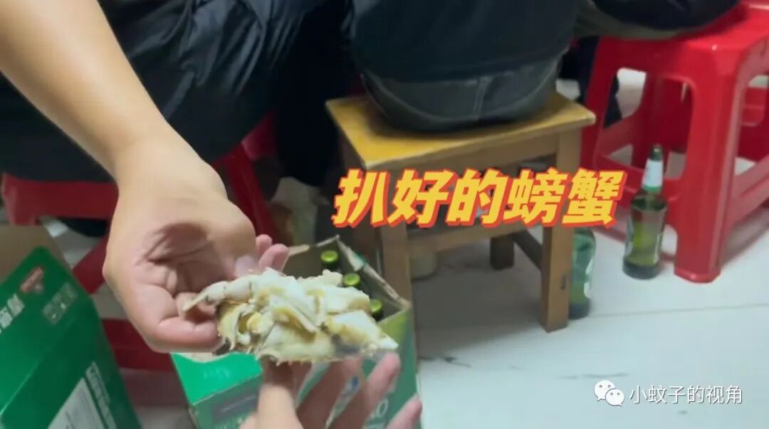 这一幕引起其他人的注意,只见男子一会儿又递过来一只螃蟹,同样已经扒好了,女子再次从容地接过来。