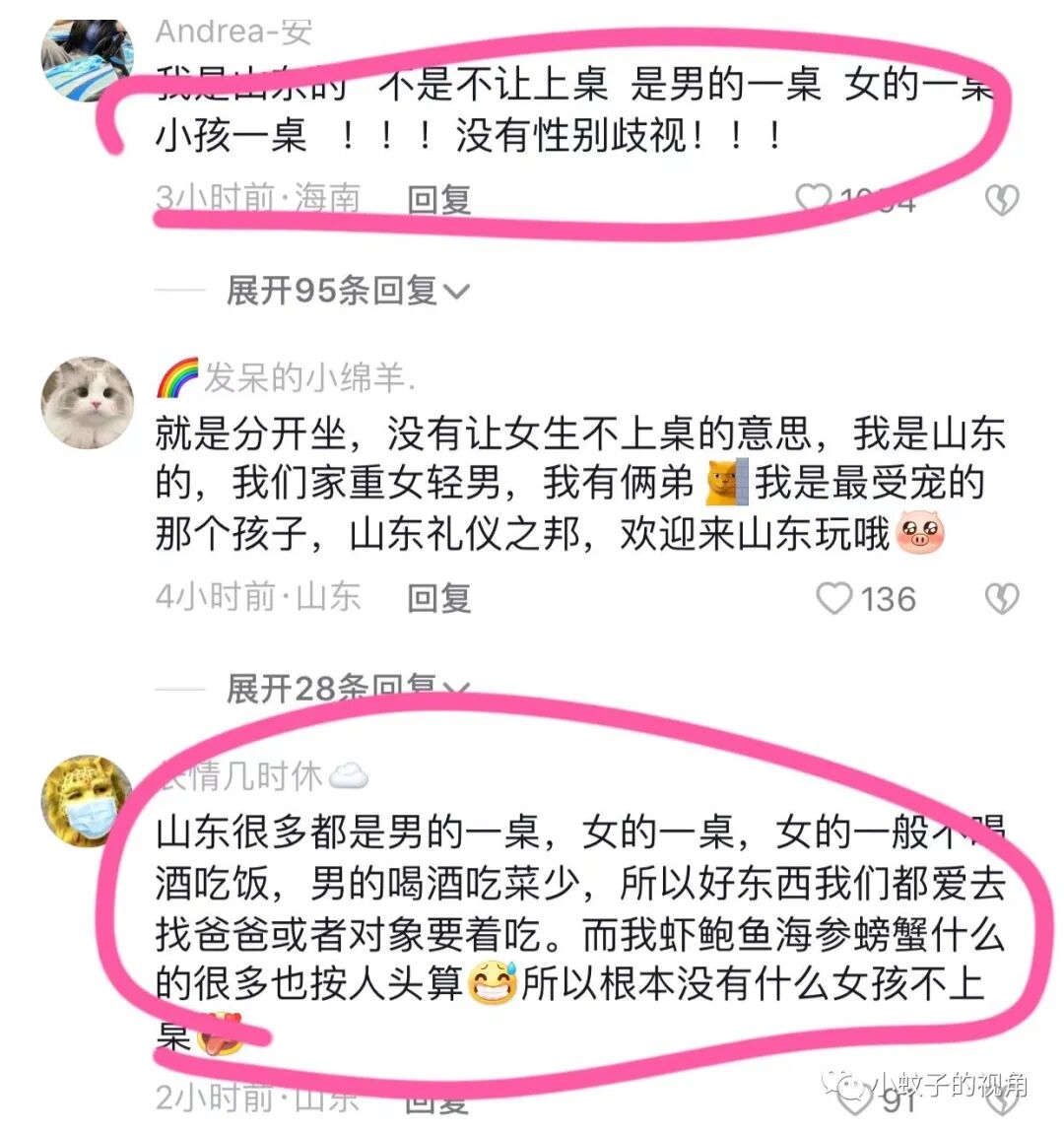 网友解释道:我是山东,真不是不让上桌,而是男的一桌,女的一桌,孩子一桌,没有性别歧视。