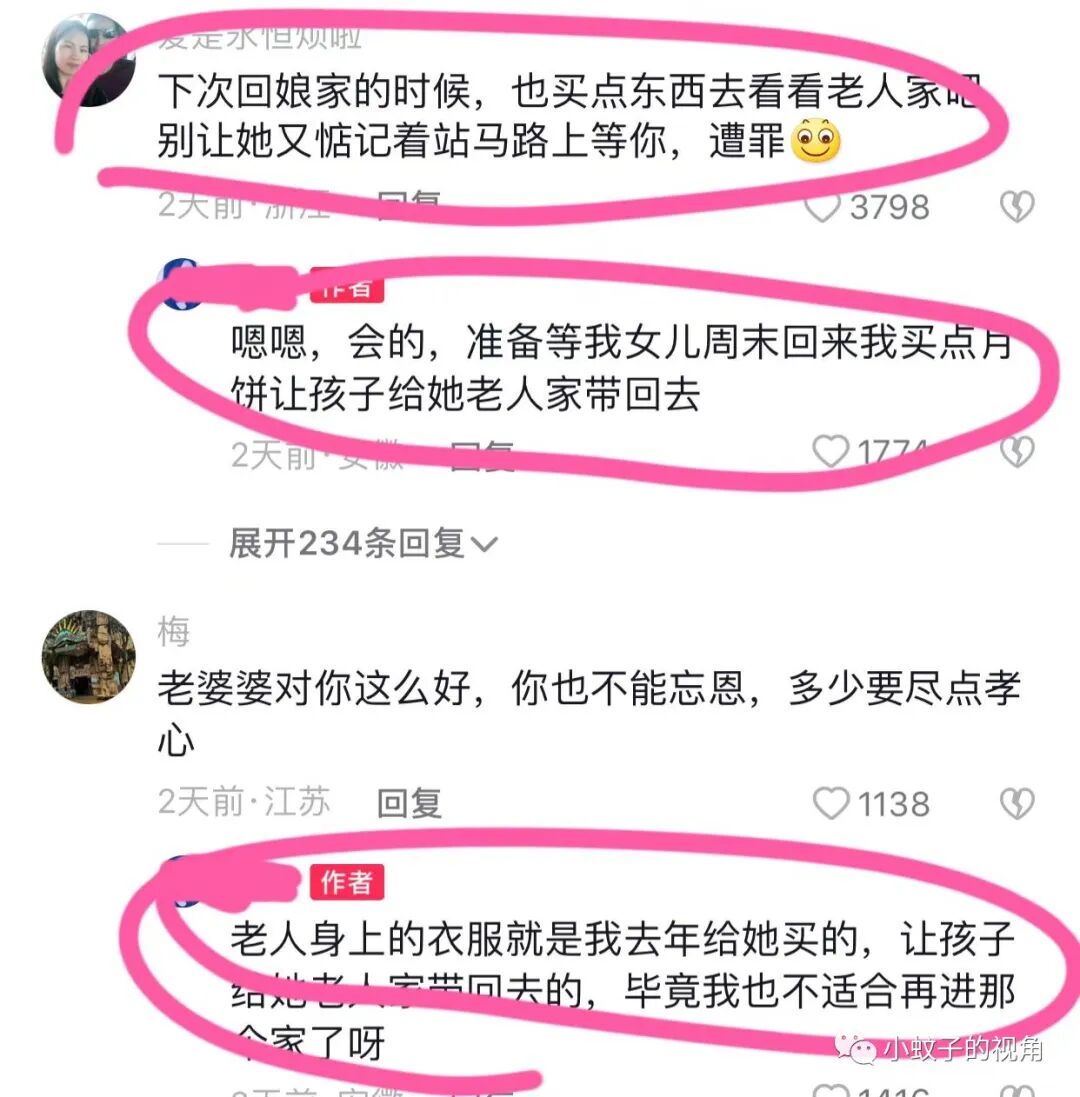 网友说:下次再回娘家的时候,你也买点东西去看看她老人家吧,别让她又惦记着站在大马路上等你,太遭罪了。