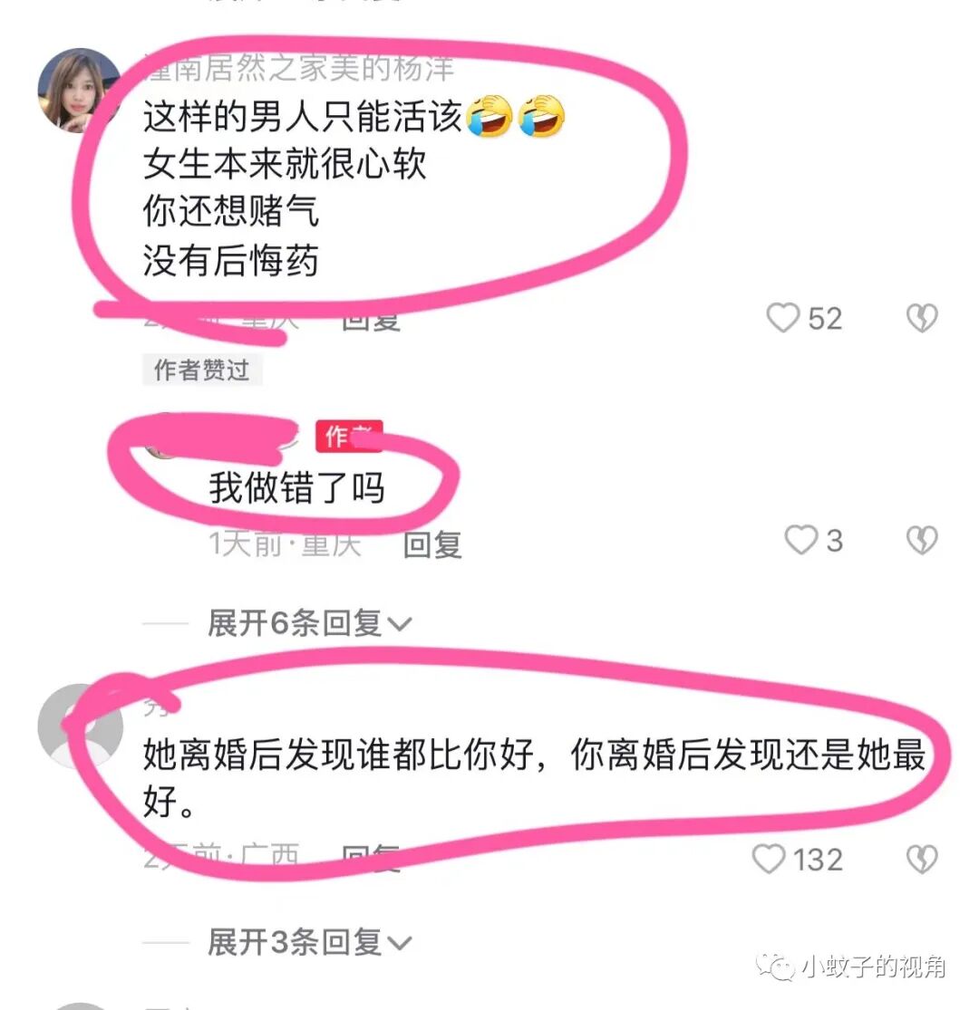 网友却说:你这样的男人只能活该,女生本来就很心软,你还跟她赌气要离婚,没有后悔药的。