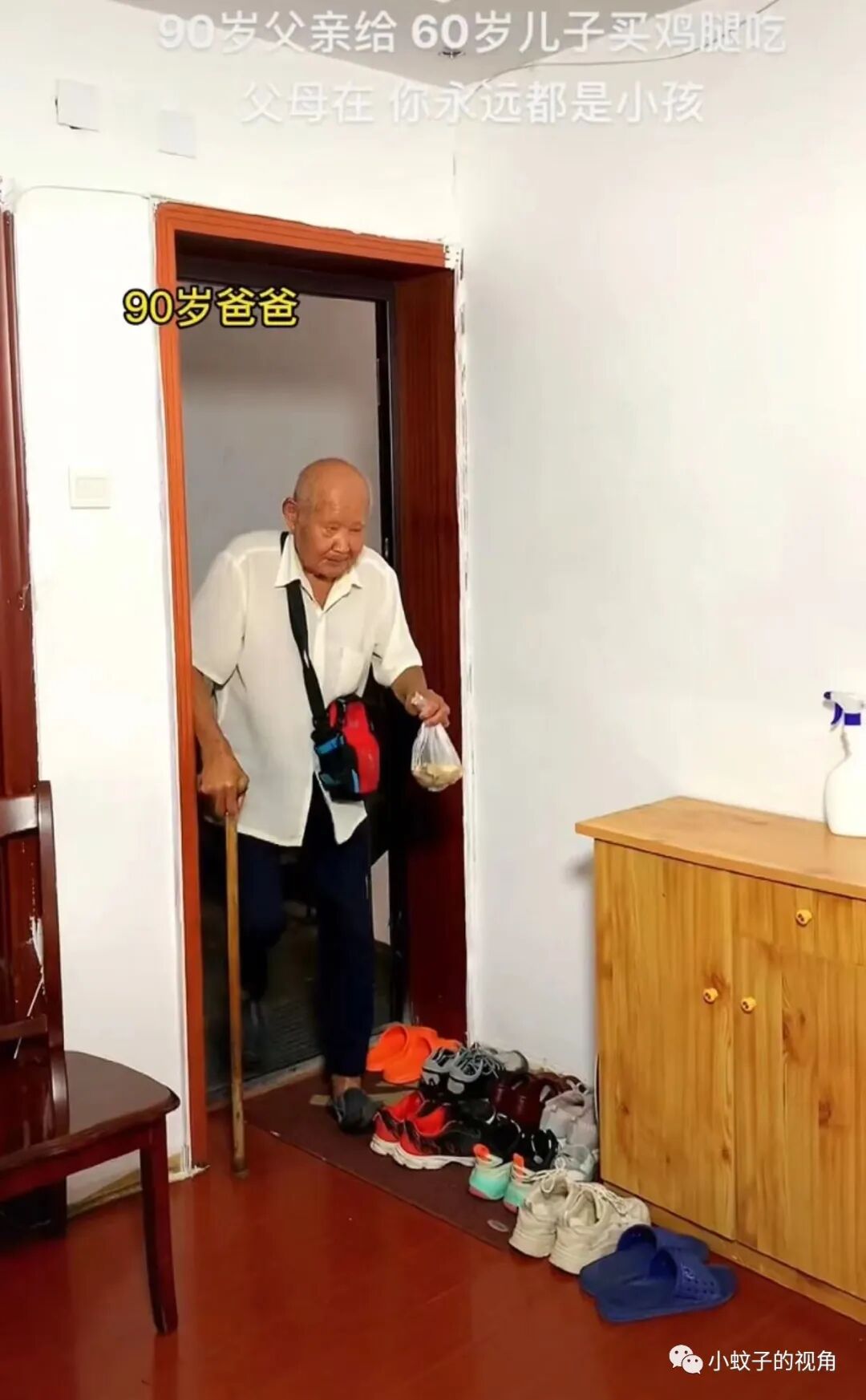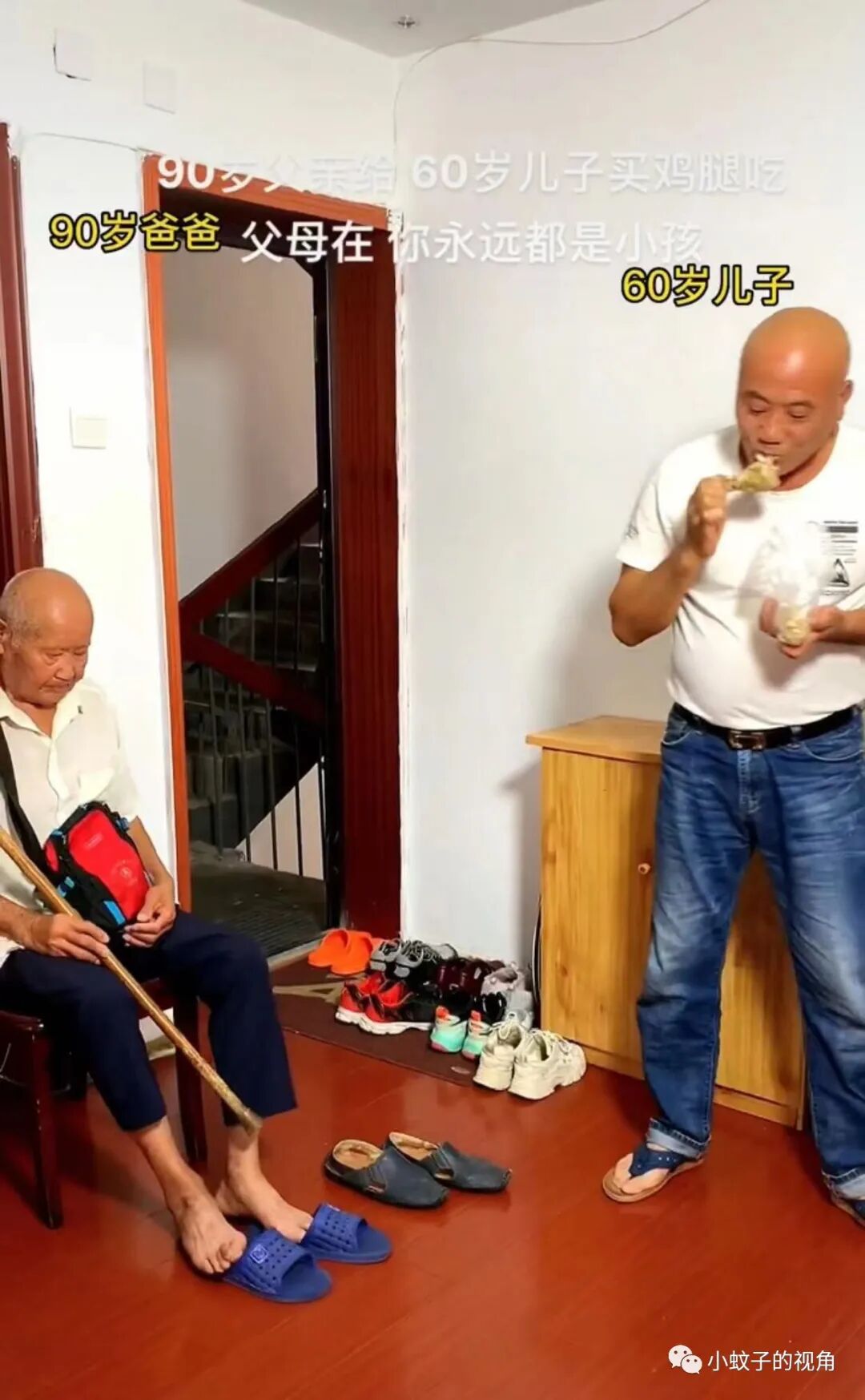 就像这对父子一样,60多岁的儿子照顾90岁的父亲,两个老人相依为命,90岁的父母出门遛弯还不忘给儿子带回一只鸡腿。