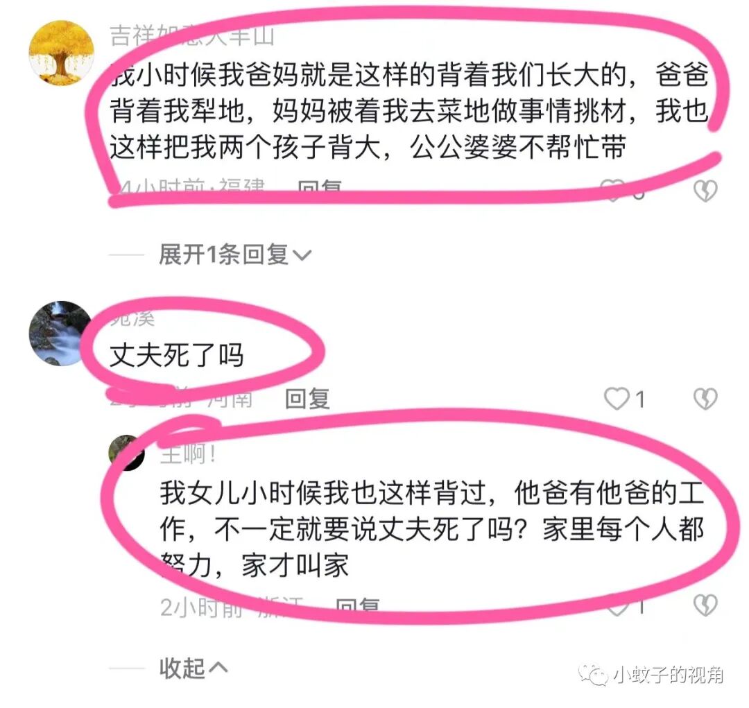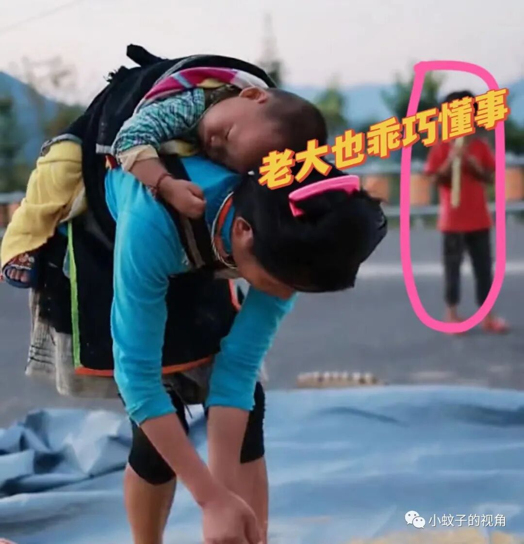 网友说:我小时候我爸妈就是这样背着我们长大的,爸爸背着我犁地,妈妈背着我去菜地里干活、挑菜。我也是这样把我的两个孩子背大的,公公婆婆也不帮忙带孩子。