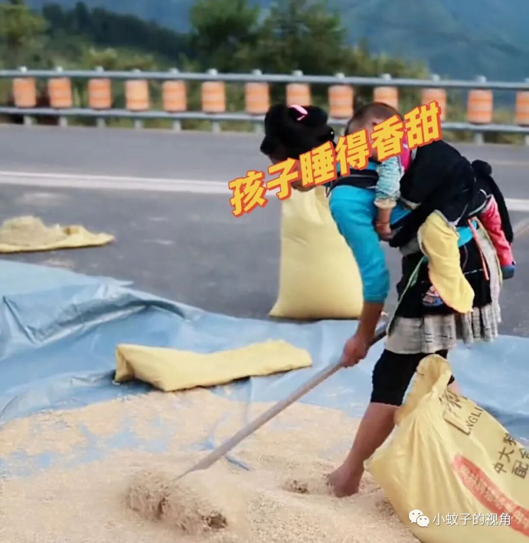 这是一位网友无意中拍摄的画面,一位身穿少数民族服饰的女人正在收拾晾晒好的小麦,在她背后还背着一个幼小的孩子。