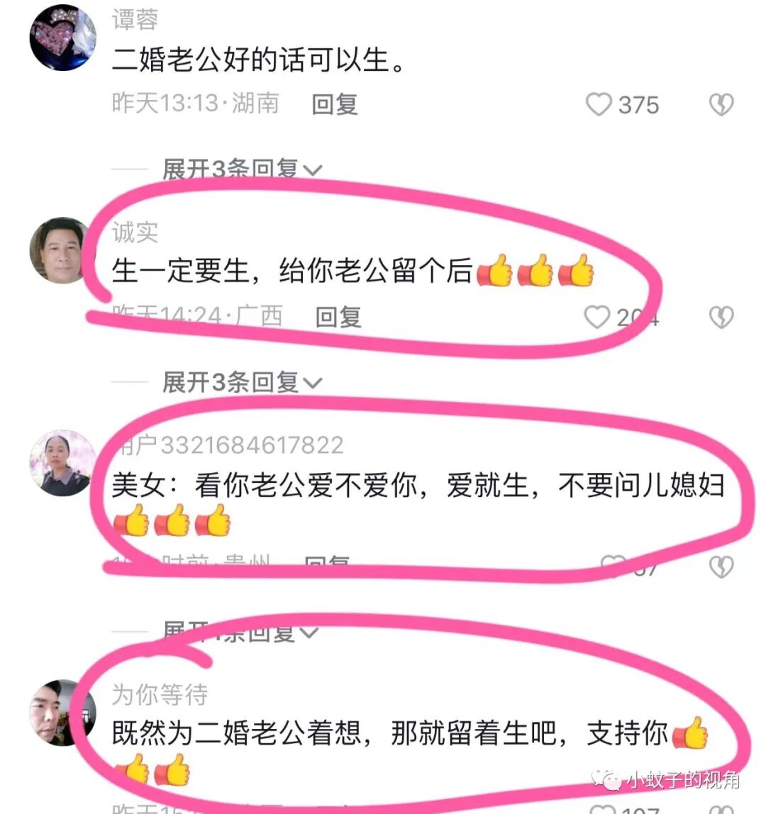 女性网友相对比较理智,说:二婚老公好的话可以生。你要看老公爱不爱你,爱的话就生,不要问儿媳妇。