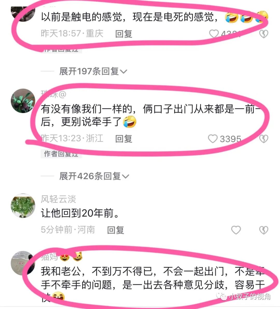 还有网友说:我和老公不到万不得已不会一起出门,不是牵不牵手的问题,而是出去就会有各种意见分歧,容易干仗。