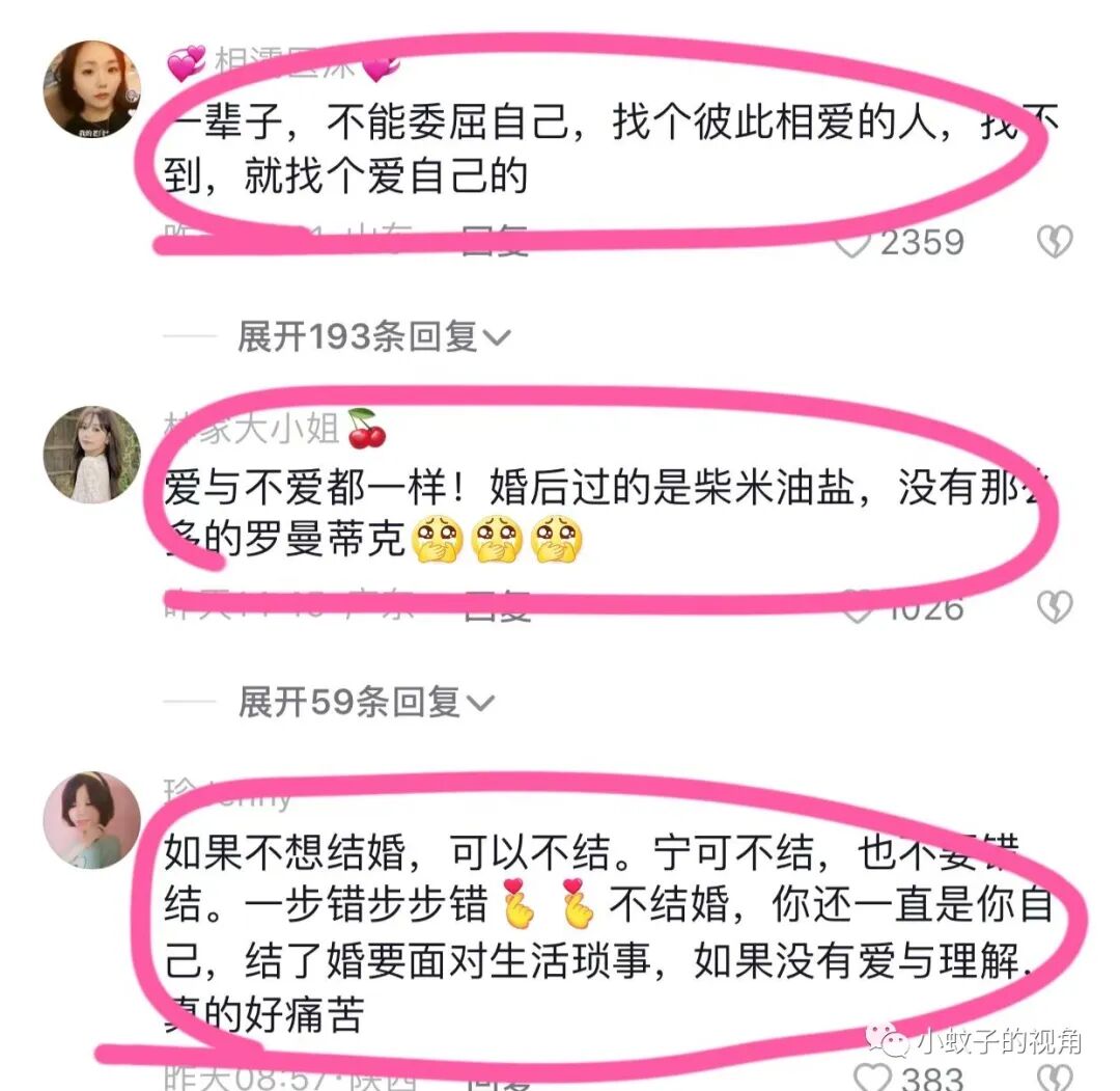 也有网友说:如果不想结婚,你可以不接。宁可不结婚,也不要结错婚。一步错步步错,不结婚你一直是你自己,结了婚就要面对生活琐事。如果没有爱与理解,生活将会很痛苦。