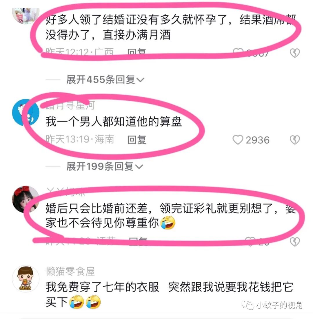 也有网友说:好多人领了结婚证没多久就怀孕了,结果酒席都没办,直接办满月酒,更别提彩礼了。
