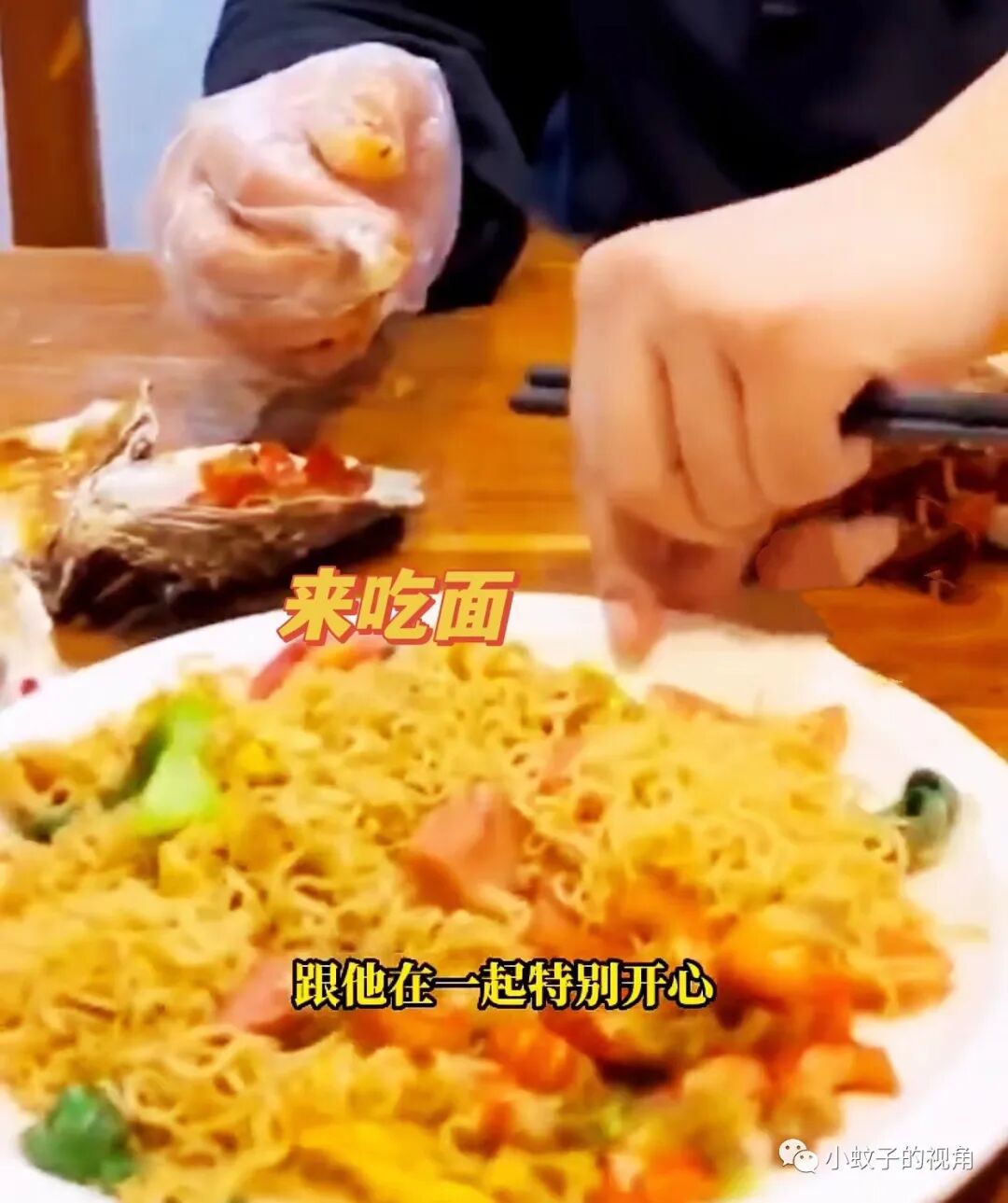 在他的面前还有一个盘子,盘子里是满满的一盘面条,上面还搭配着青菜和火腿肠,再加上龙虾尾,看起来食欲满满。