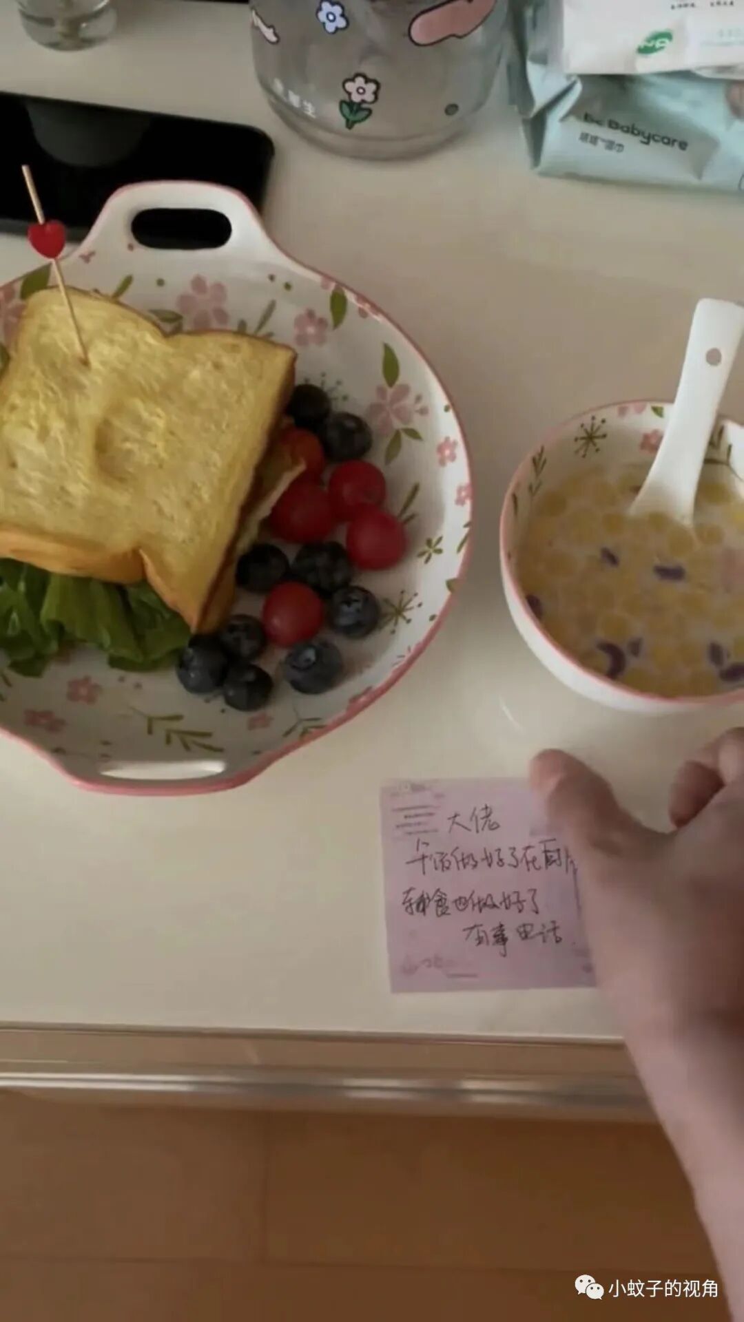 然后再准备好孩子的辅食,同样放在蒸锅里。然后自己吃完饭,留下纸条后悄悄地关上门,出去上班。