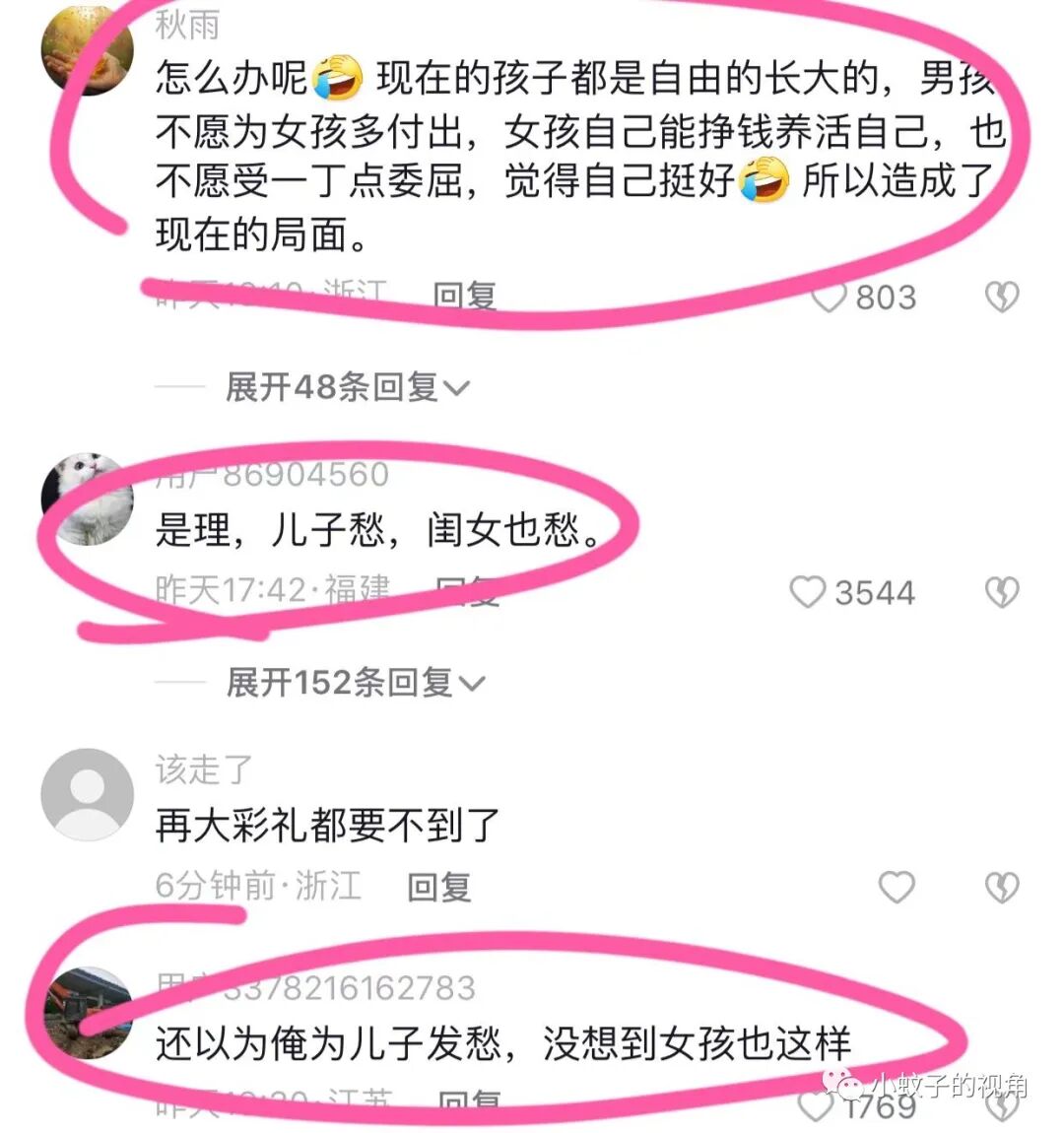 有位网友一下子说到了事情的真相,她说:现在的孩子都是自由自在地长大的。男孩不愿为女孩付出,女孩觉得自己能赚钱养活自己,也不愿受一丁点委屈。都觉得自己挺好的,所以才造成了现在的局面。