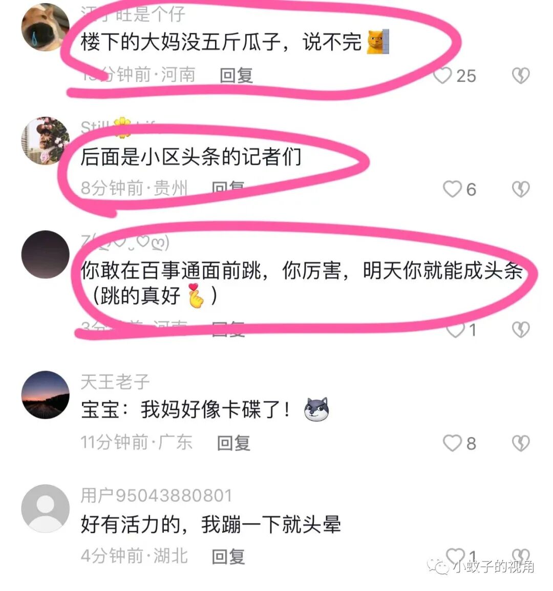也有网友说:楼下的大妈们没有5斤瓜子,都说不完(女子跳舞的事)。