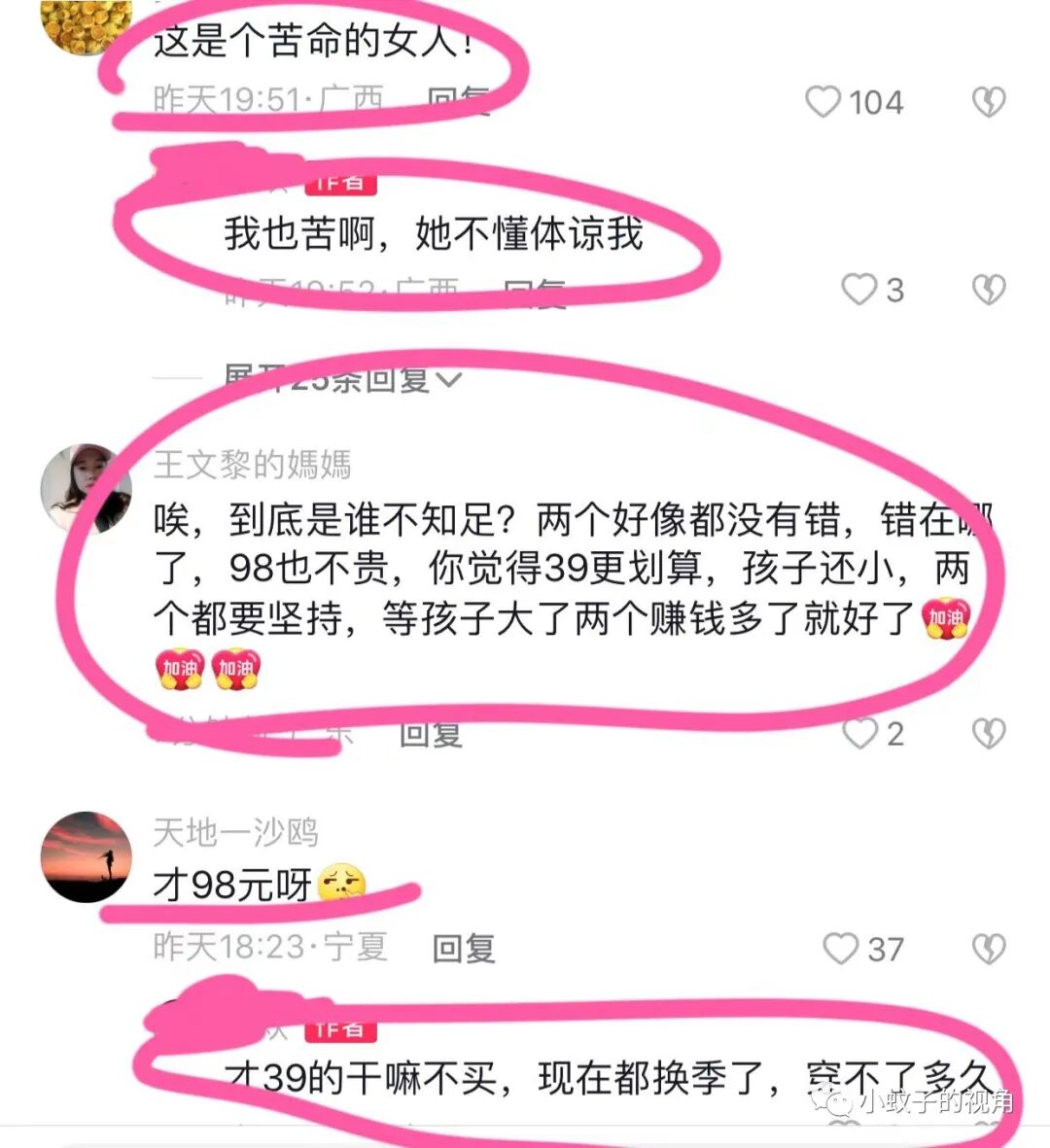 也有网友说:到底是谁不知足?两个好像都没有错,错在哪里?98块钱也不贵,你却觉得39更划算。现在孩子还小,两个人都要坚持,等孩子大了两个人都能赚钱就好多了。