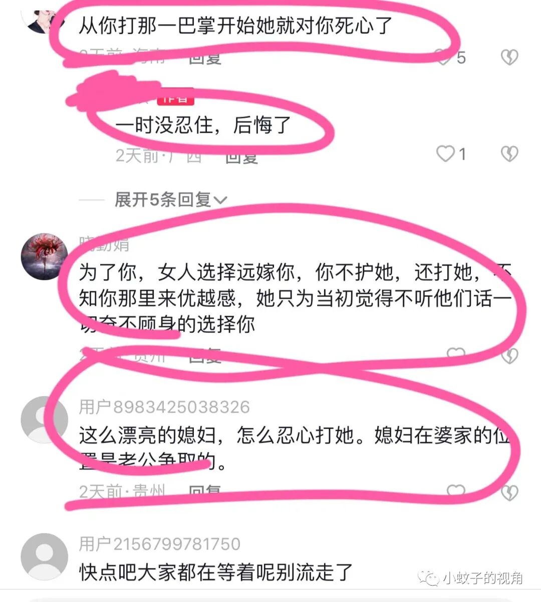 还有网友说:这么漂亮的媳妇你怎么忍心打她?媳妇在婆家的位置都是老公给争取的!