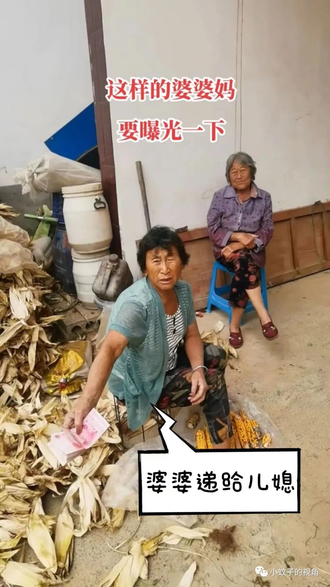 最近把玉米全部卖掉了,一共卖了一万零五百块钱,公公只留下了500块钱,把剩下的一万块递给婆婆,示意婆婆把这一万块钱给儿媳。