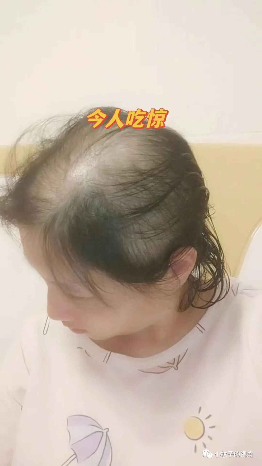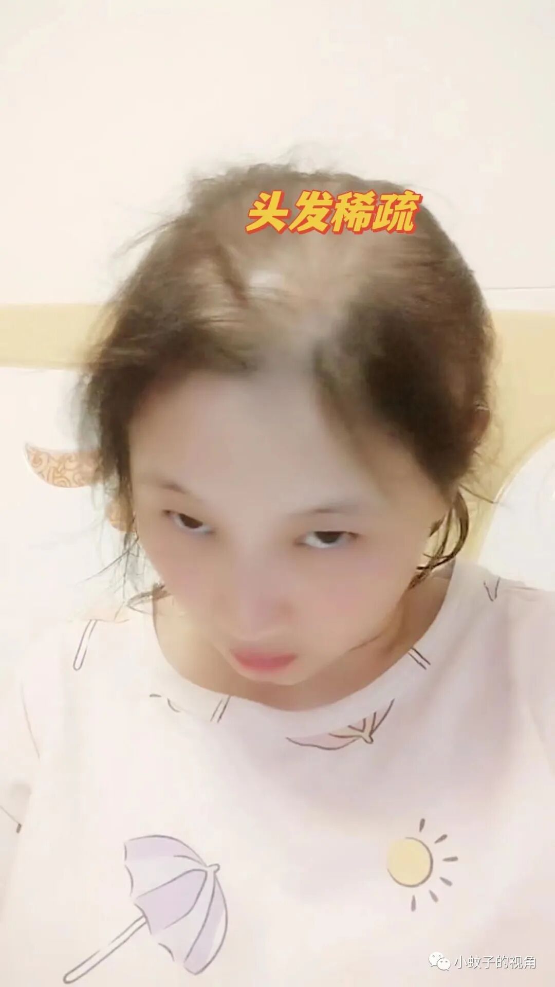 看上去长发及颈的她,低下头来发现:原来是之额头和颈部的头发还能看得过去,头顶几乎已经没有头发了,露出了白花花的头皮,看得令人心疼不已。