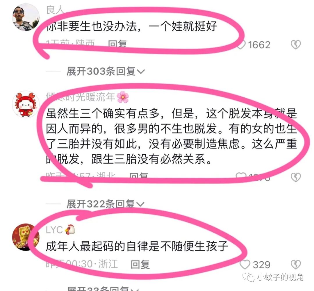 网友说:虽然三个确实有点多,但是,这个脱发本身就是因人而异。很多男的不生孩子也脱发。有的女生也生了三胎并没有这样严重。没必要制作焦虑,这么严重的脱发跟生三胎没有必然关系。