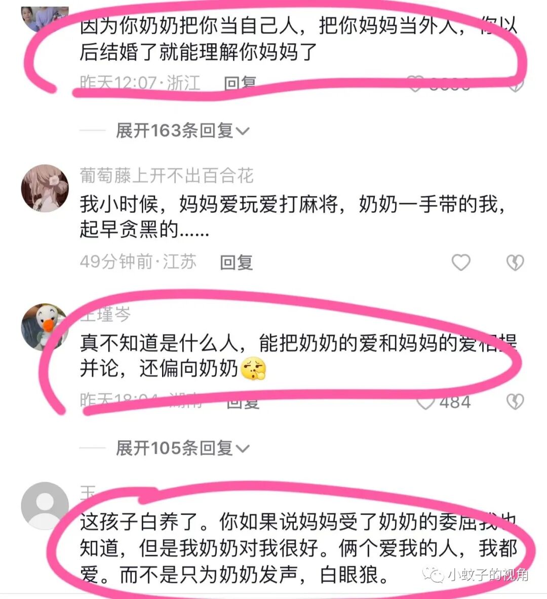 还有网友替妈妈抱屈:这孩子白养了。你应该说:“妈妈受了奶奶的委屈,我知道,但是奶奶对我很好。两个爱我的人,我都爱。”而不是只为奶奶发发声,声讨妈妈。白眼狼。