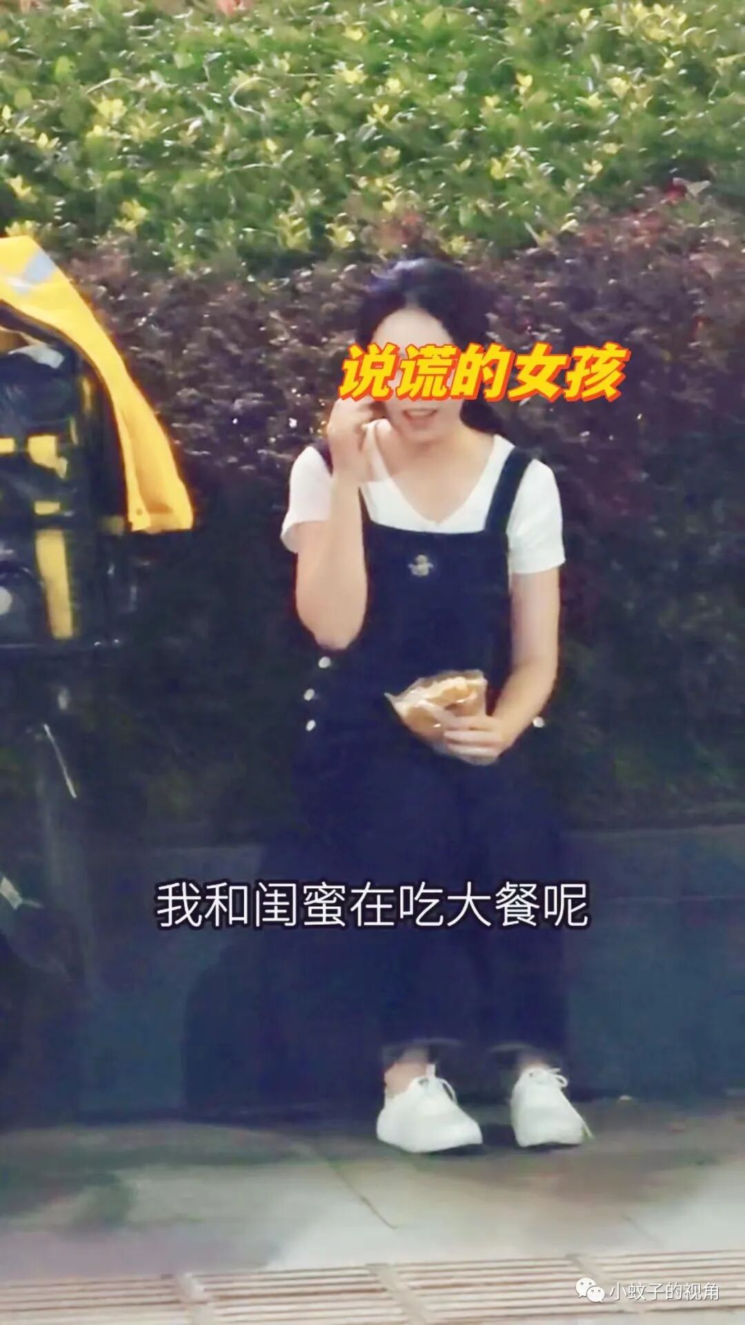 在邻居的指引下,他终于在路边看到了妻子,妻子正穿着外卖员的服装,拿着一块面包吃得香。