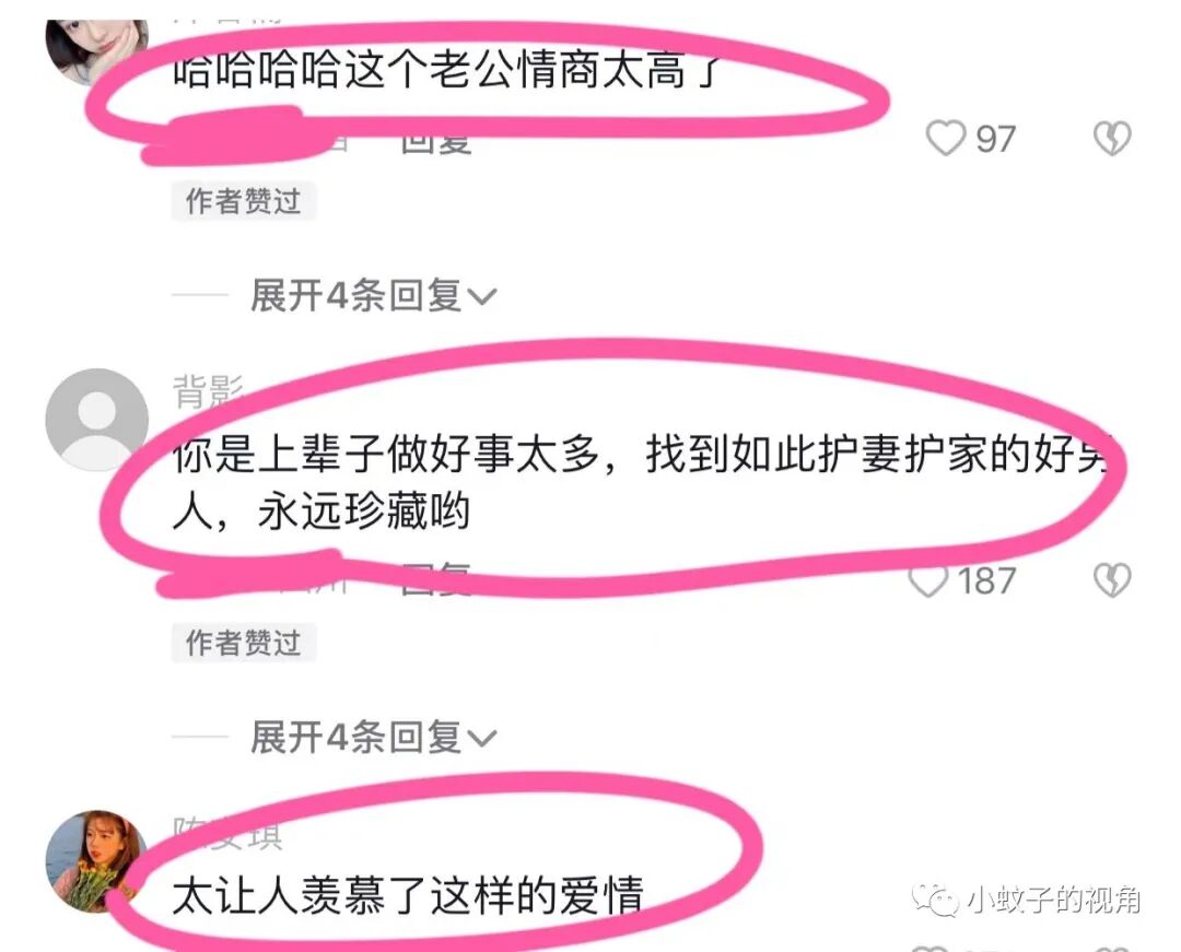 也有网友说:你是上辈子做好事太多了,找到了如此爱护妻子,爱护家庭的好男人,要永远珍藏啊!