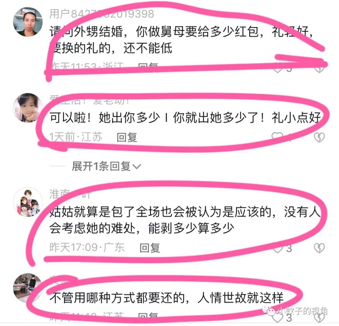 网友对这位嫂子的行为感到不齿,说:请问外甥结婚,你做舅母的给多少红包?礼轻才好,都是要还礼的,还不能低了!