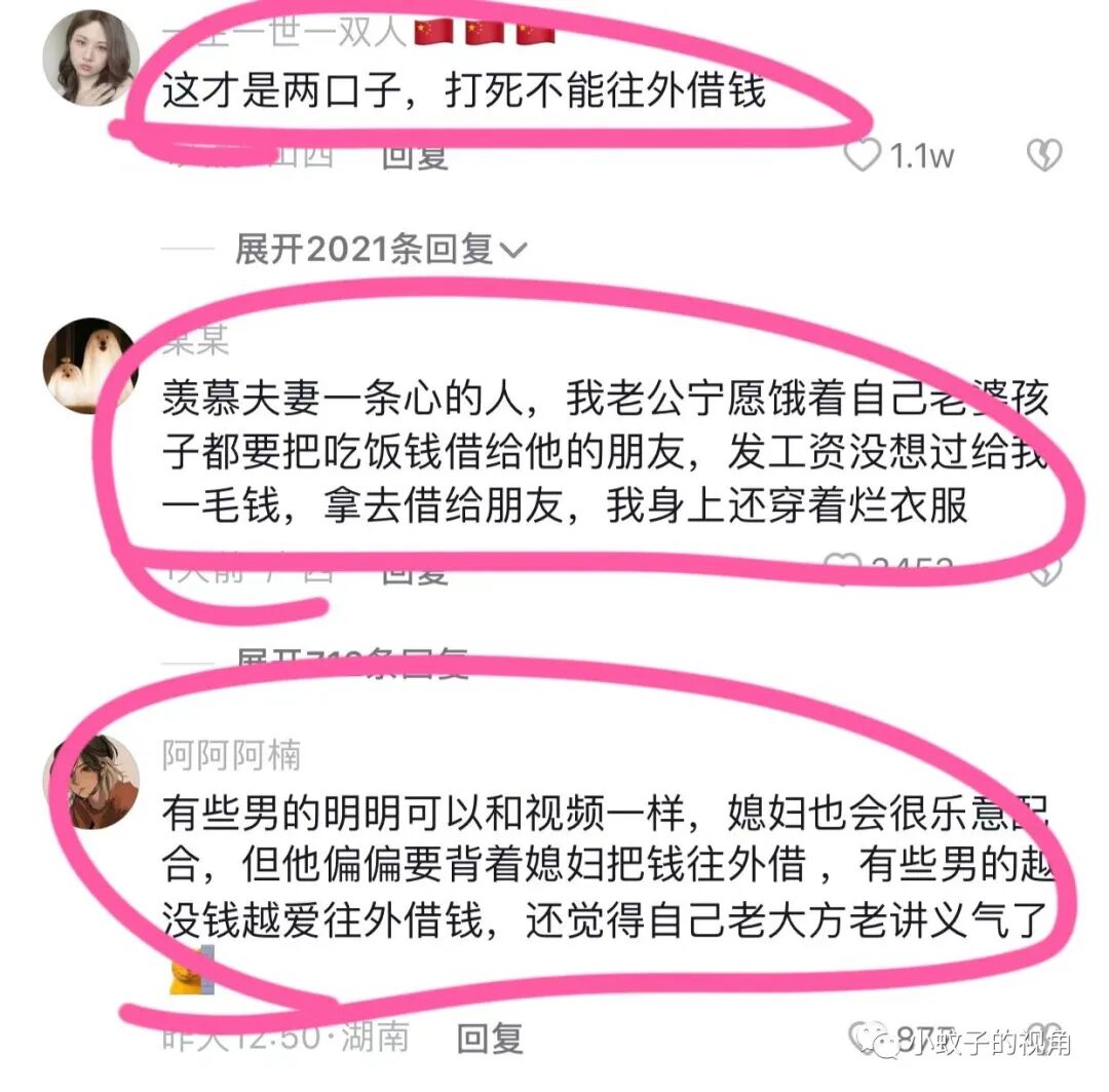 还有网友说:有些男的明明可以这样做,媳妇也会很乐意配合,但他偏偏要背着媳妇把钱往外借。有些男的越没钱越爱往外借钱,还觉得自己老大方、老讲义气了。