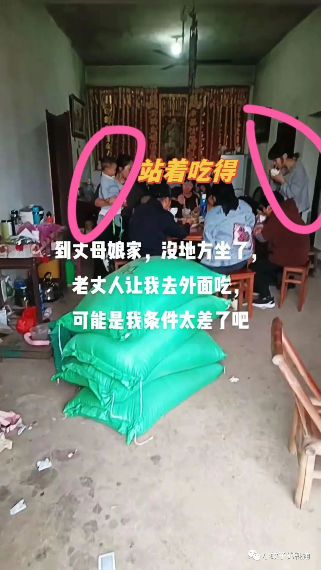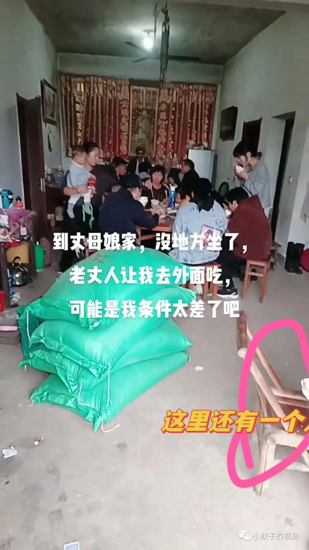 还有网友说:看样子老丈人家庭条件不咋地,又不是只有你一个人没上桌,你没看餐桌旁边还有人站着吃饭吗?又有一个在一边喂孩子的。你凑合一顿也饿不死。