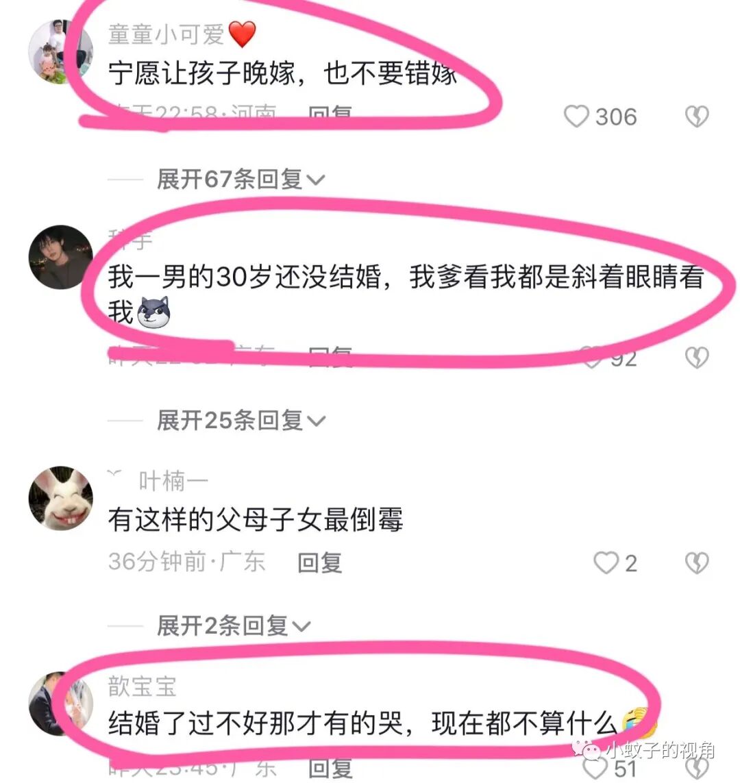 也有网友感同身受,说:我作为一个男的,30岁了还没结婚,我爹看我都是斜着眼睛的。