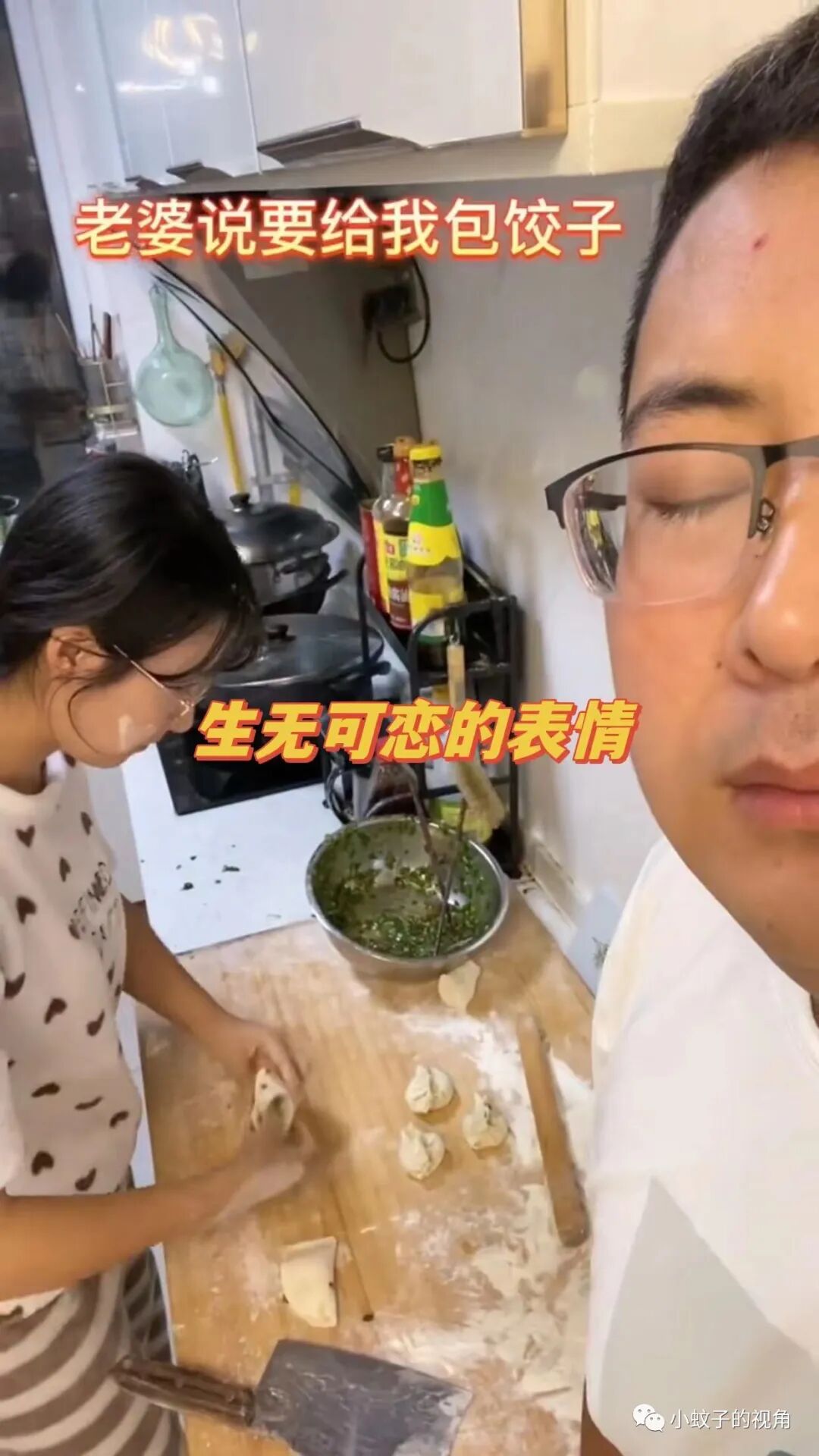 老婆应该也是挺为难,脸上抹得都是面粉,正在慌手慌脚地忙碌着。