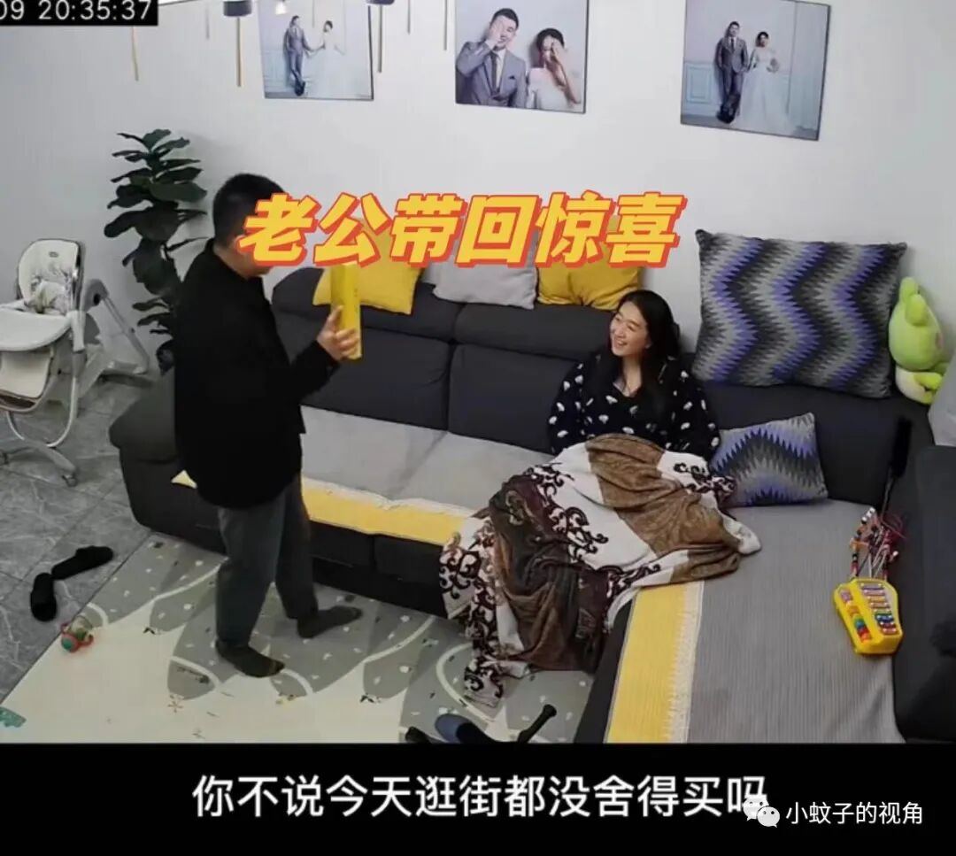 等他下班回到家后,孩子已经睡着了,妻子正盖着毯子坐在沙发上,看到老公回来也没起身,看着老公笑得开心。