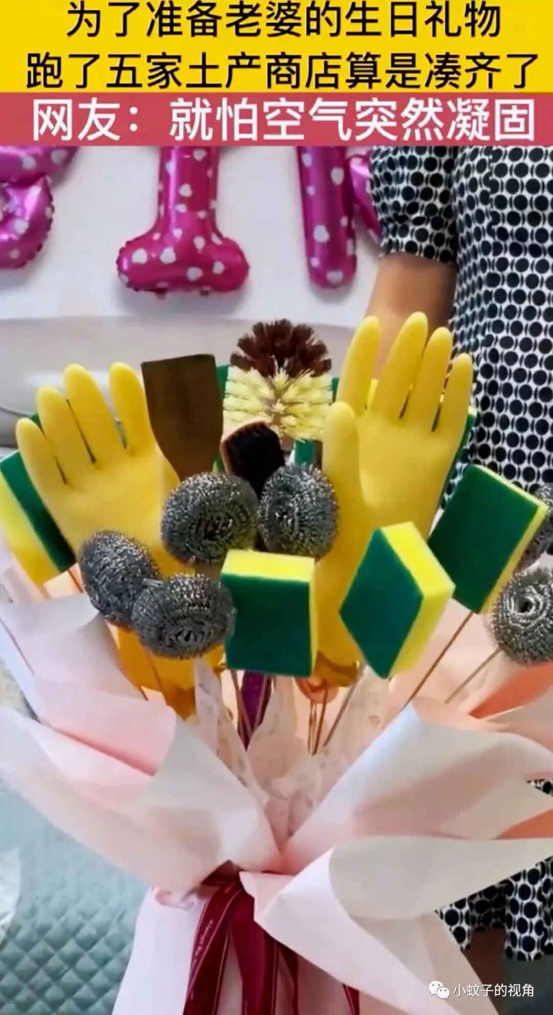 这个花束使用洗碗布、钢丝球、锅铲、马桶刷子和橡胶手套组成的,外面包上包装纸,你别说,做得还像模像样,橡胶手套还贴心地塞上了东西,撑得鼓鼓的!