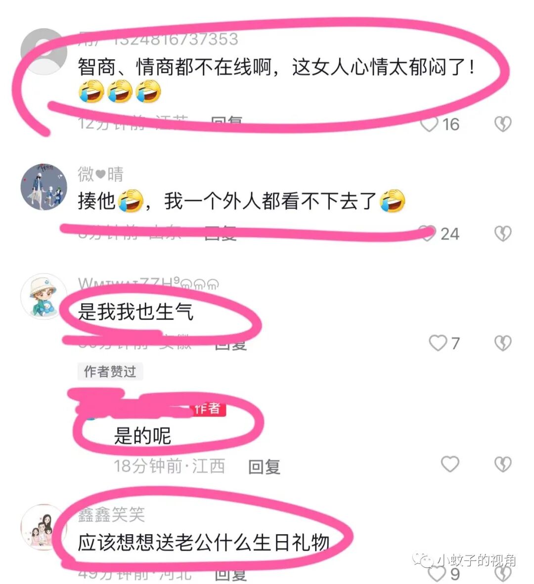 网友忍不住捂眼,说:这是智商、情商都不在线啊,这女人心情太郁闷了!