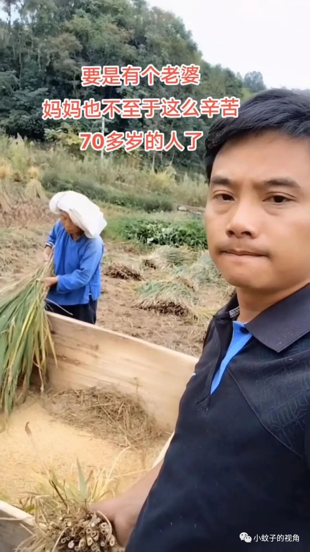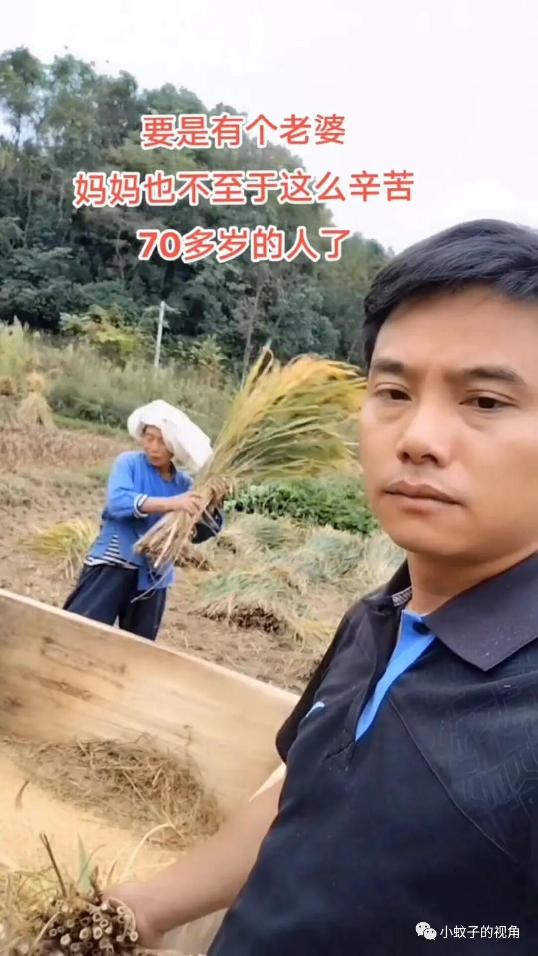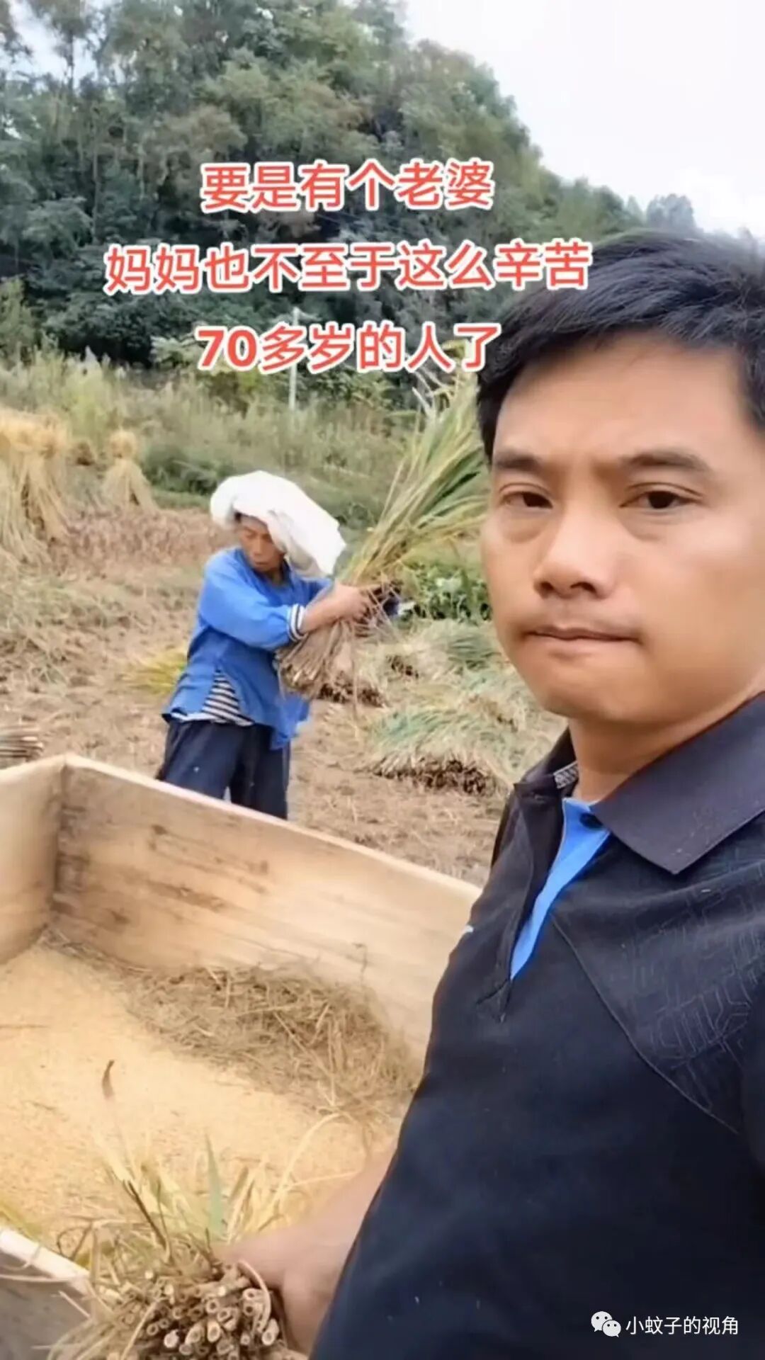 又到了收稻谷的时候,看着母亲辛苦地打谷子,他不仅不帮忙,却拿着手机感慨:如果我有个媳妇就好了。