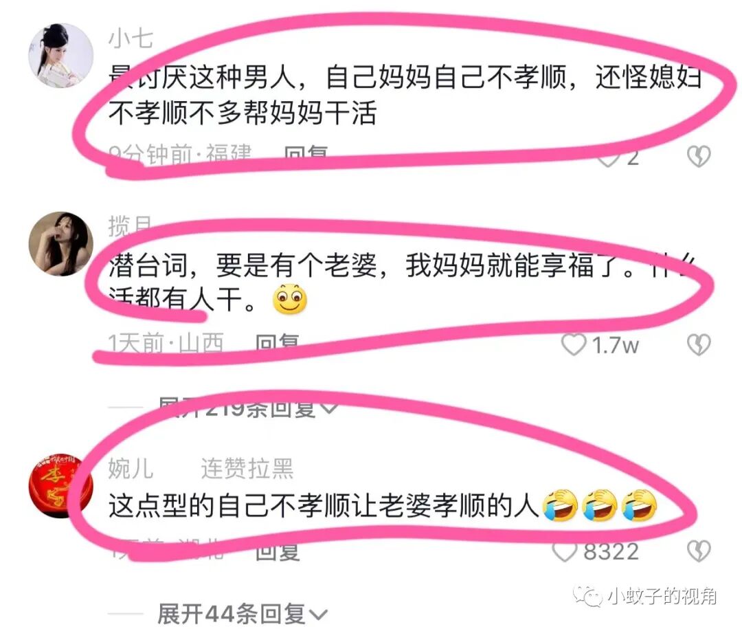 也有网友说:最讨厌这种男人,自己妈妈自己不孝顺,还乖媳妇不孝顺,不多帮妈妈干活。