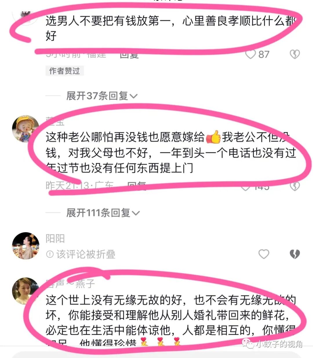 网友说:选男人不要把钱放在第一位,心里善良、孝顺比什么都重要。