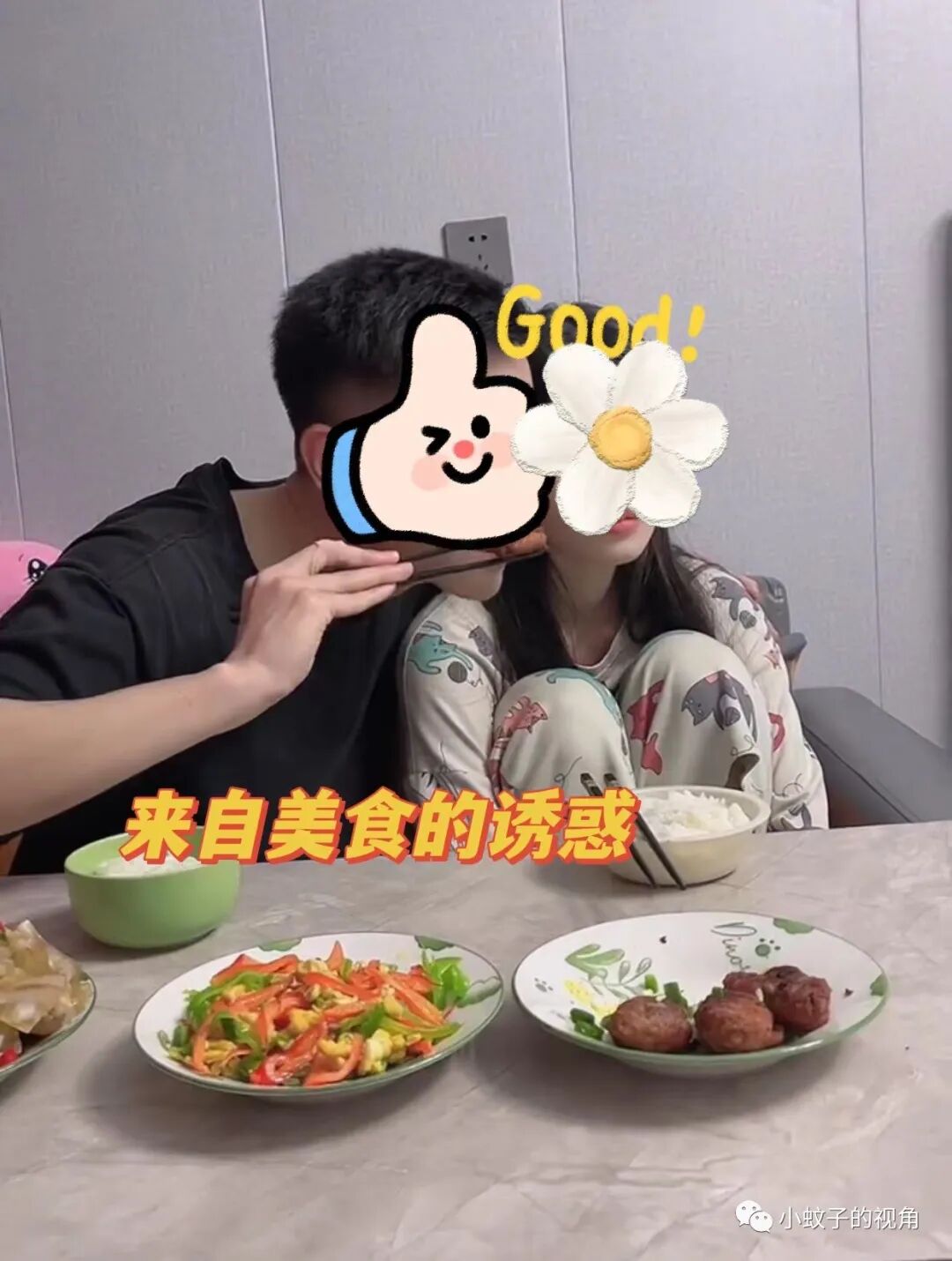 老公见状,一手抱着老婆,夹起一块藕合,放在自己鼻子底下闻闻,夸张地说:“哇,真香啊!”顺便放在老婆嘴边引诱一下。